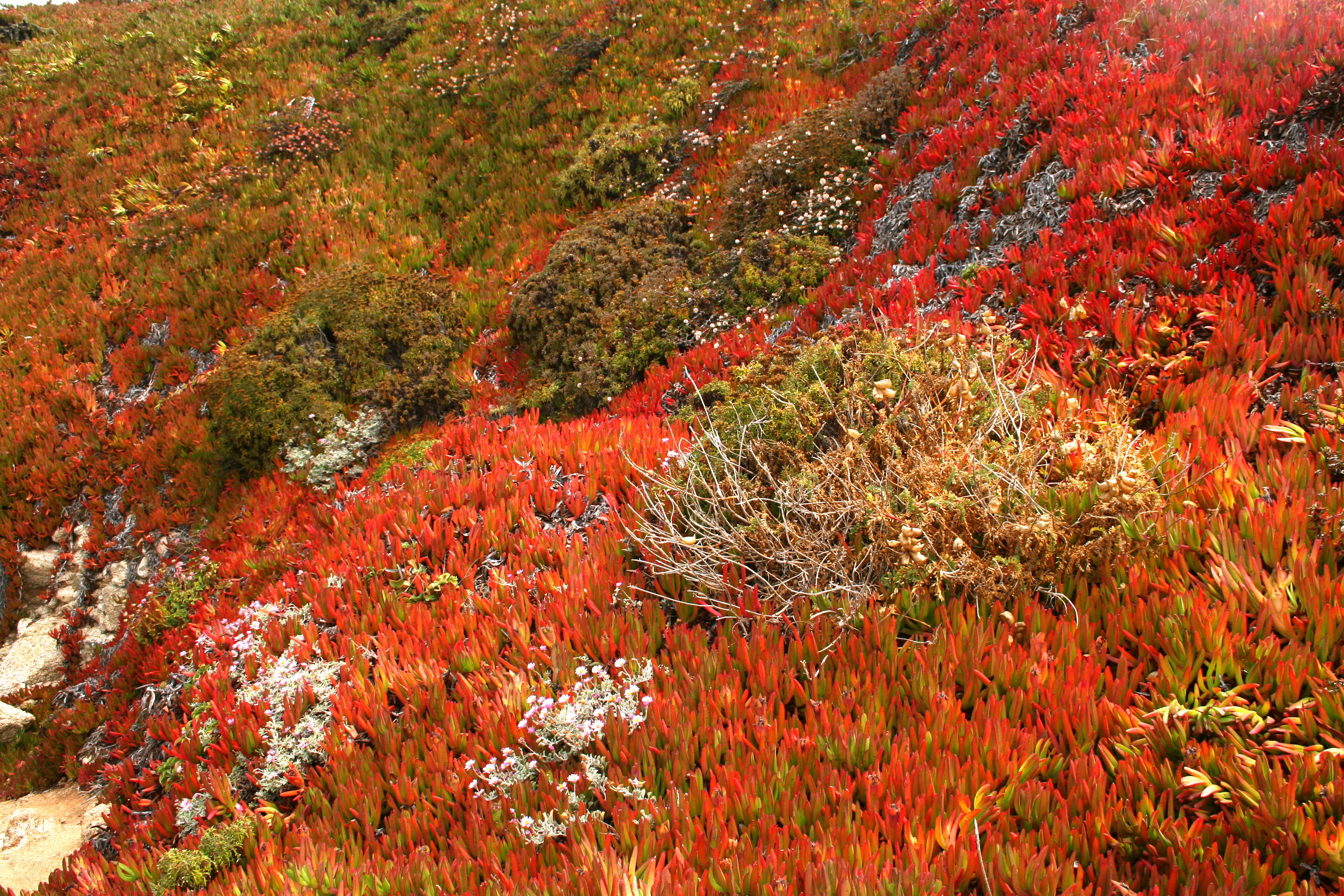 The red vegetation that catches your eye is ice plant. After the dry summer it turns this wonderful color.