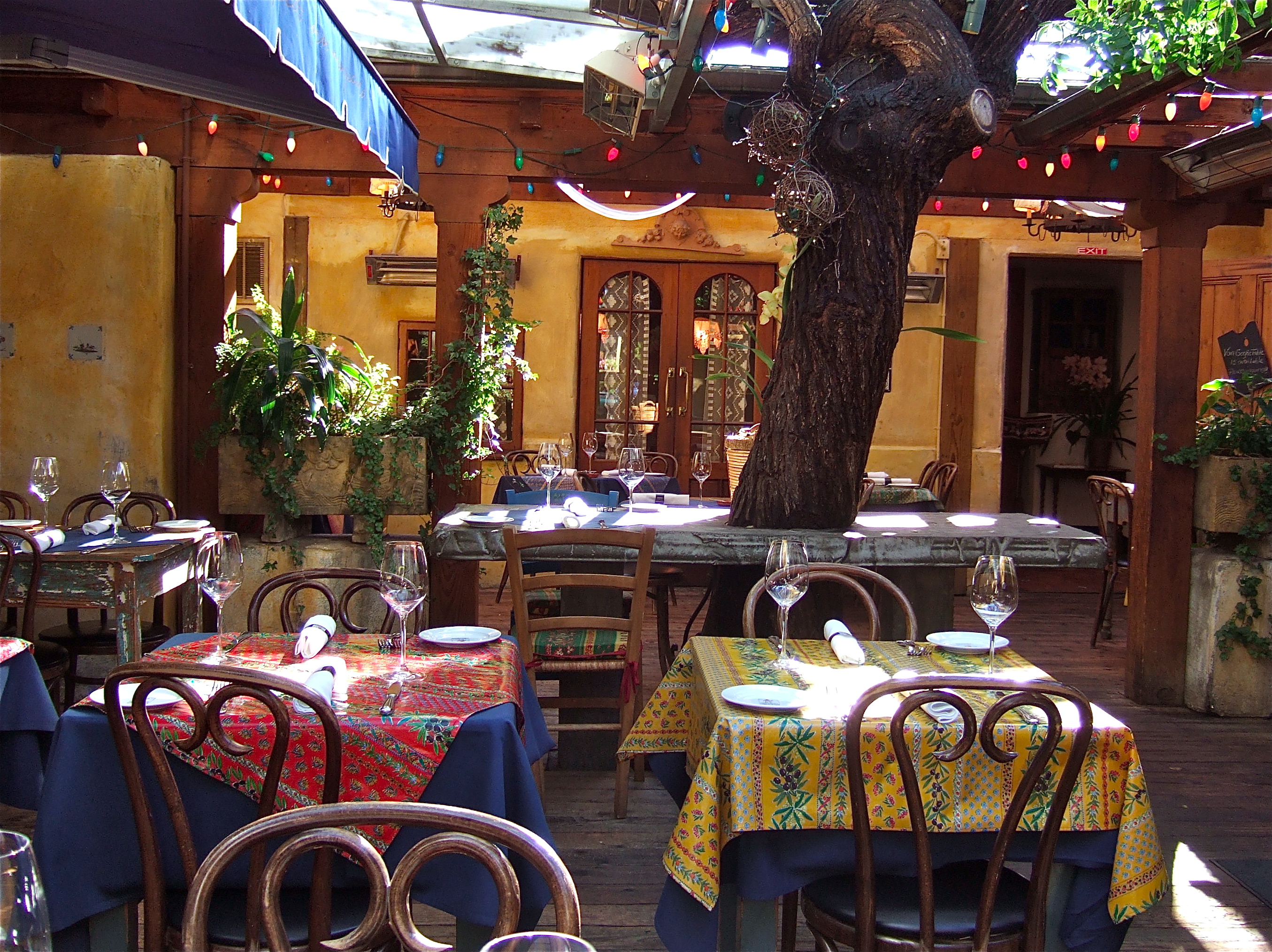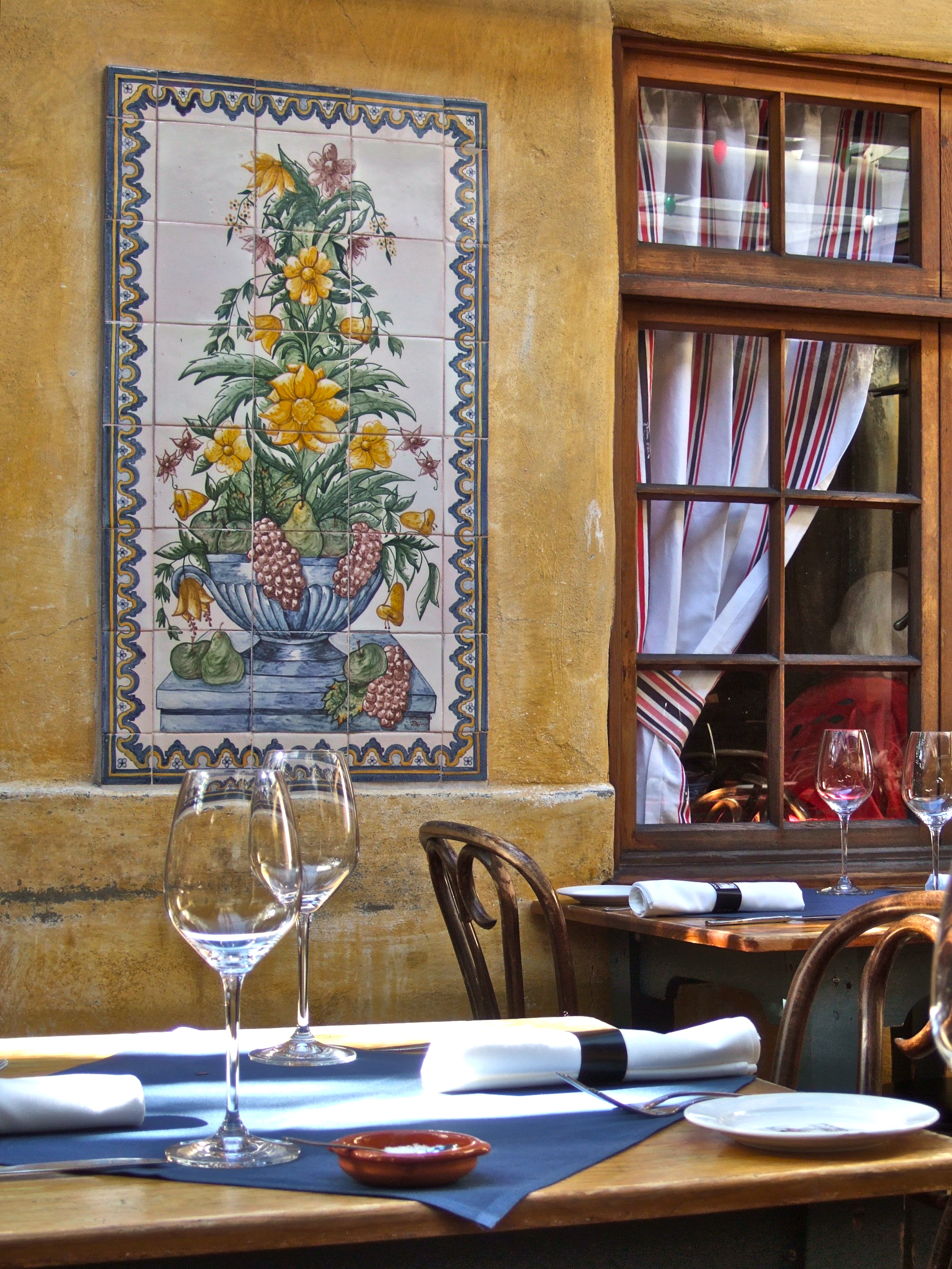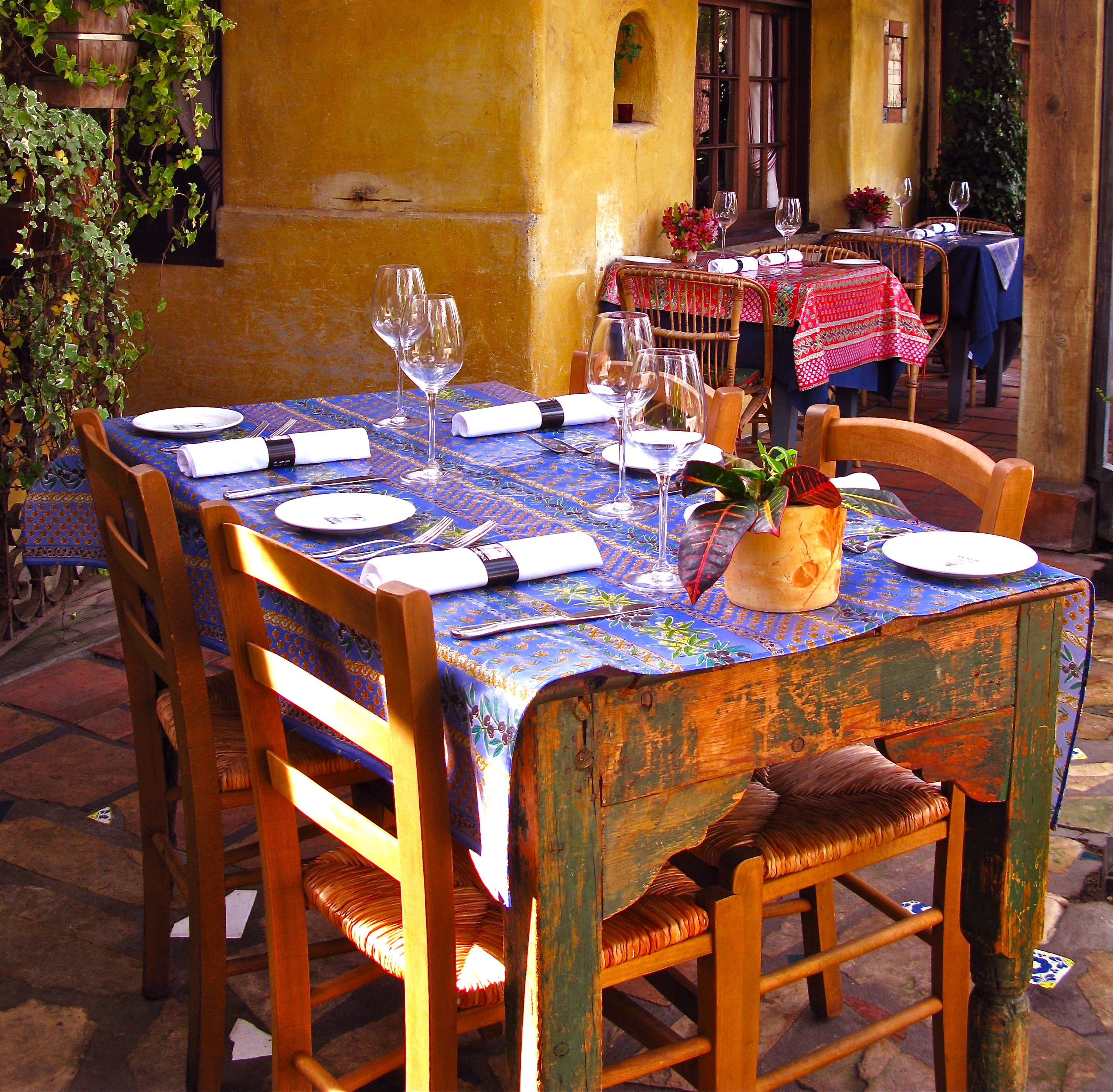 or ask for the interior patio – our personal favorite. A huge tree grows from the center of the room and a table is built around it. There is a fountain to add a little “music” and the loose awning covers overhead allow an occasional bird to fly through and peck at our feet for crumbs. It is often chilly in Carmel so we ask the waiters to turn on the overhead heaters to keep cozy.