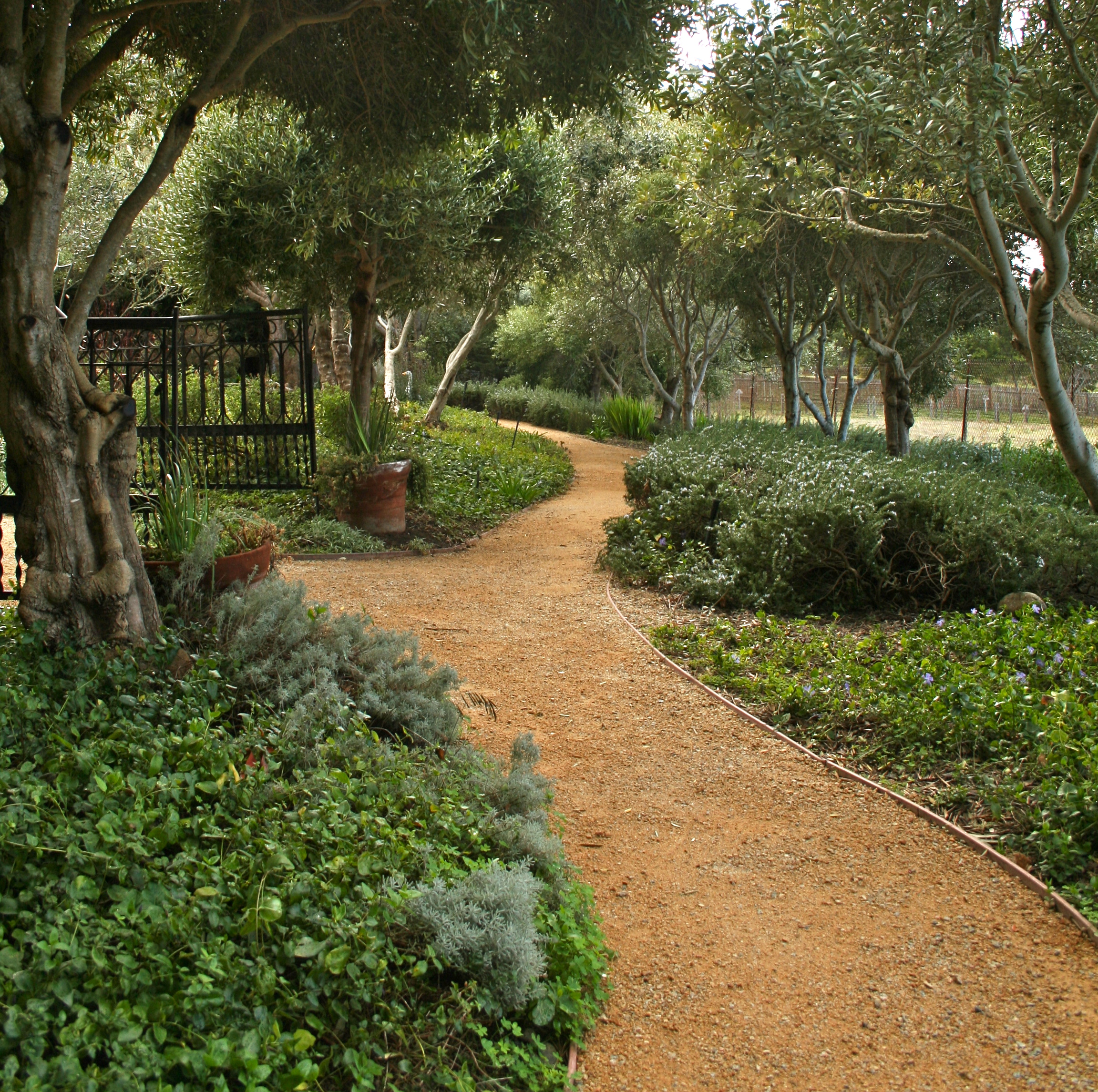 Gravel paths weave in and out of shrubbery enclosed “rooms”.