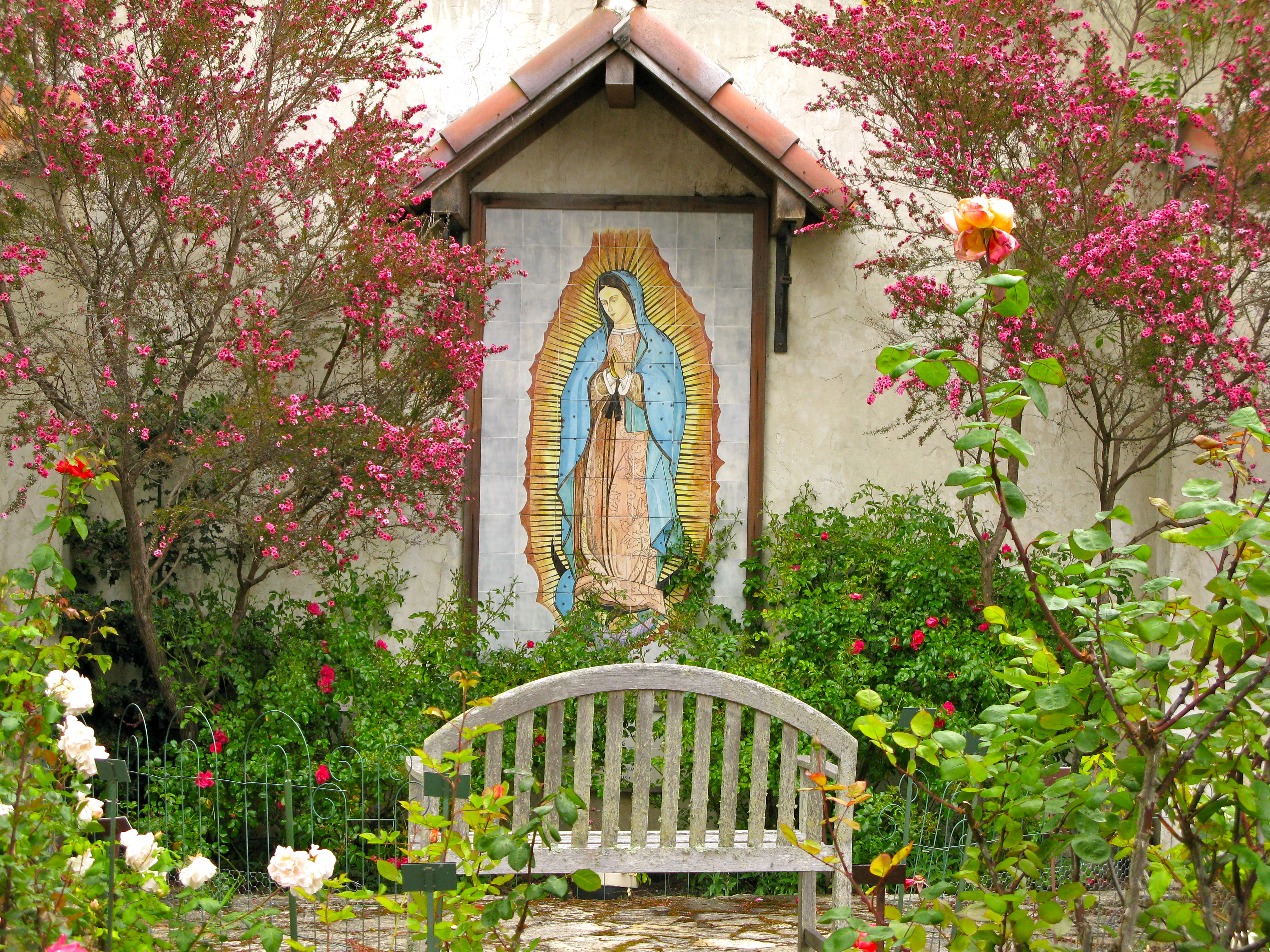 This is so appropriate for she is located in a rose garden that the Nuns have  planted here in remembrance of nuns who are now deceased.