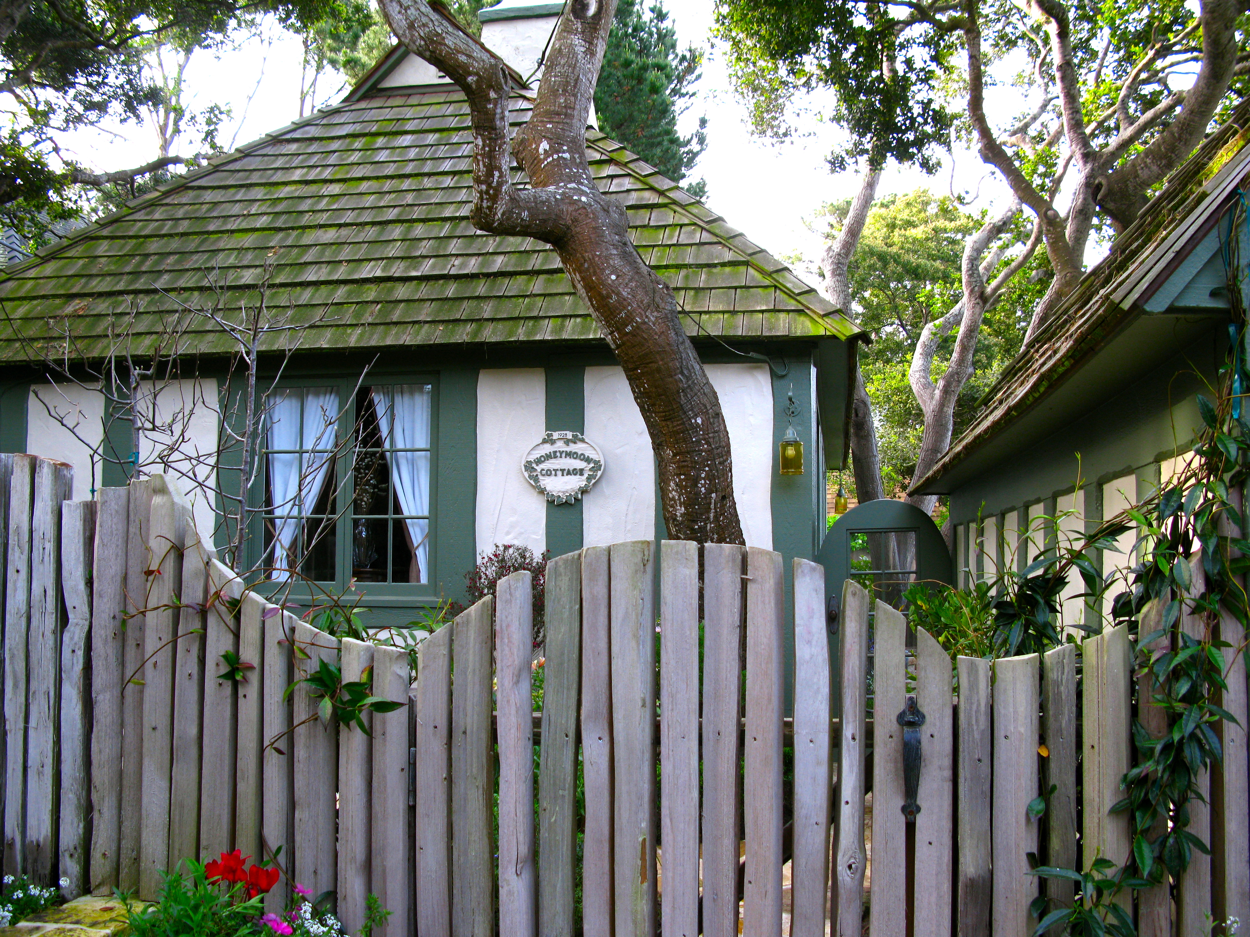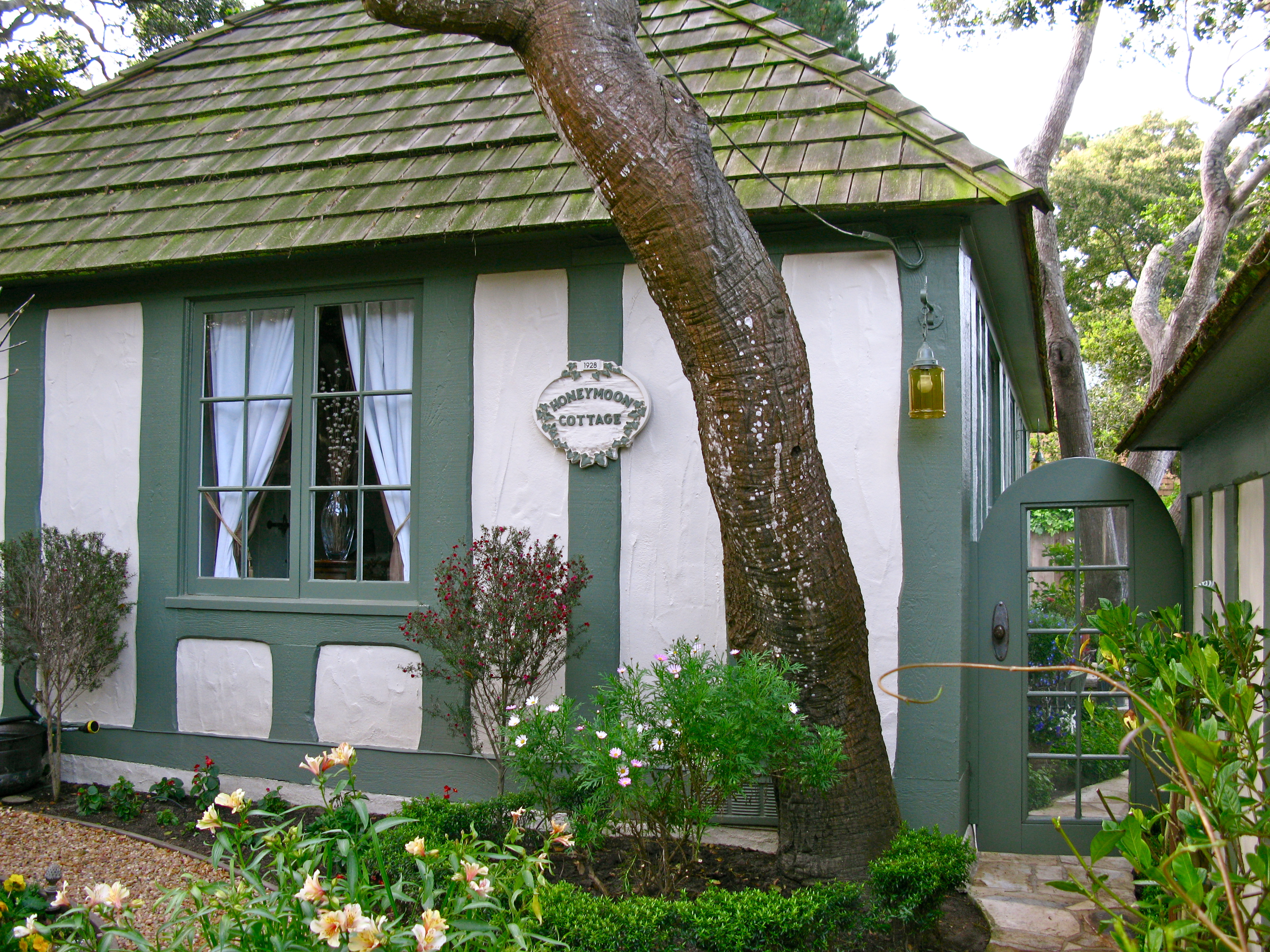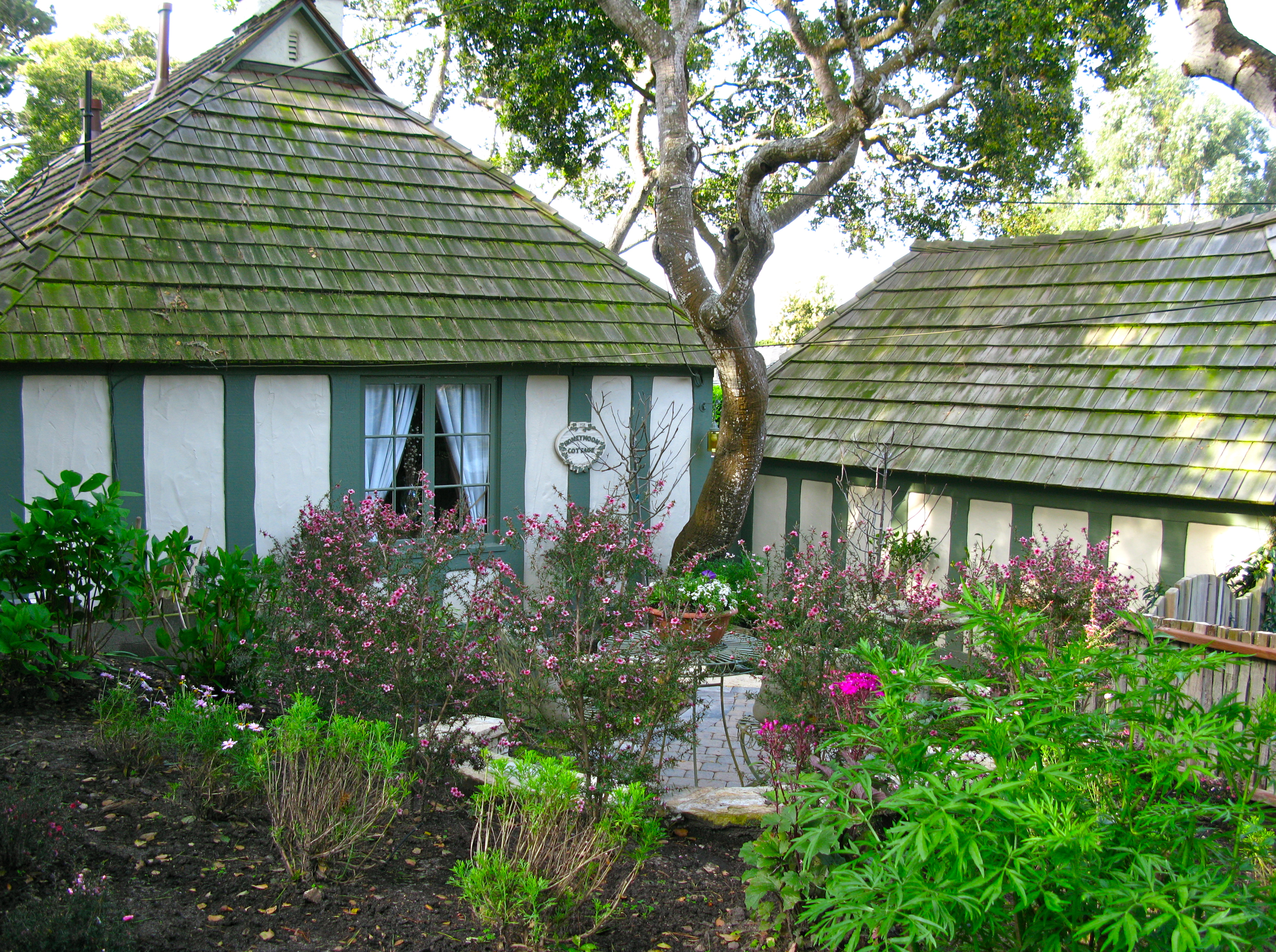 Still following the meter reader, I huff and puff my way up 6th Avenue. Honeymoon Cottage is about 1/2 block up on 6th Avenue. In 1928 an eastern investor named W.O.Swain convinced Carmel City Council to let him buy and develop a small 5 unit subdivision around a shared garden.
