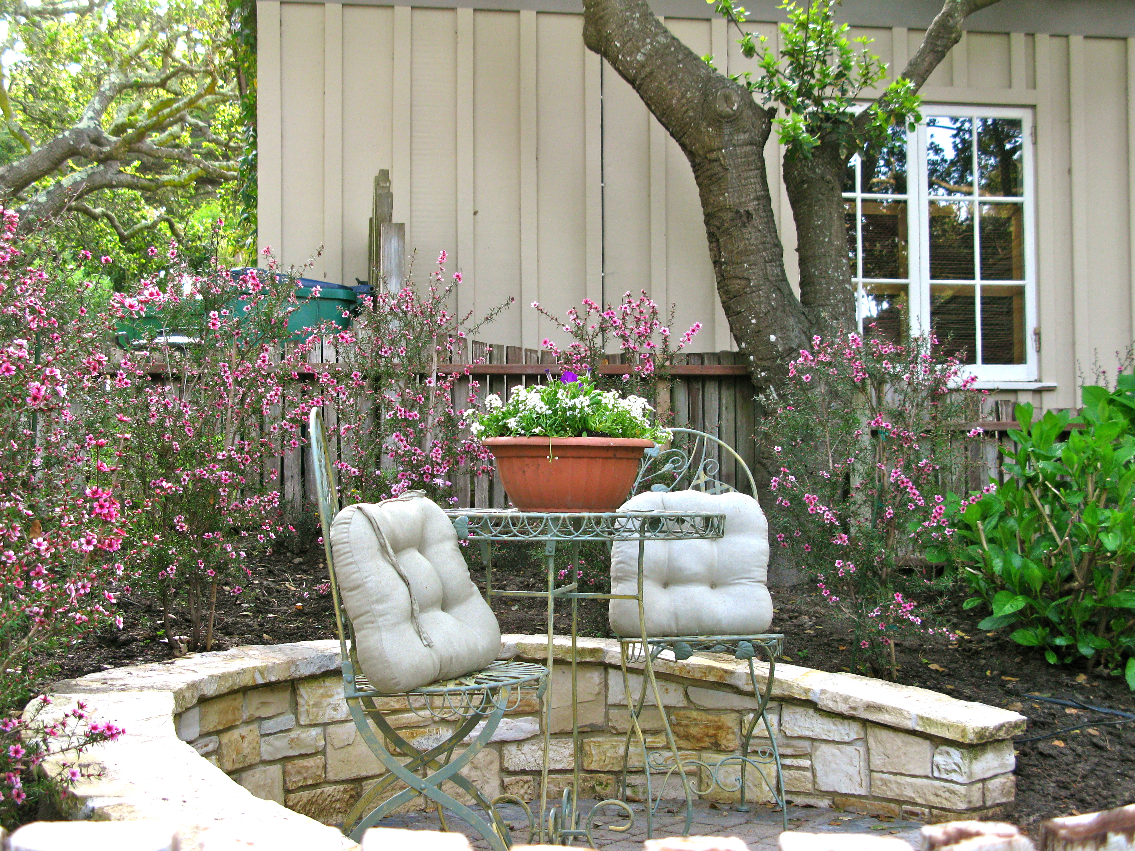 The New Zealand Tea Tree is in bloom around the Carmel Stone patio. It is a study in soft pastels – green, white and pink- with a bowl of pansies and sweet alyssum placed on the table. Those old live oak trees provide the shade.