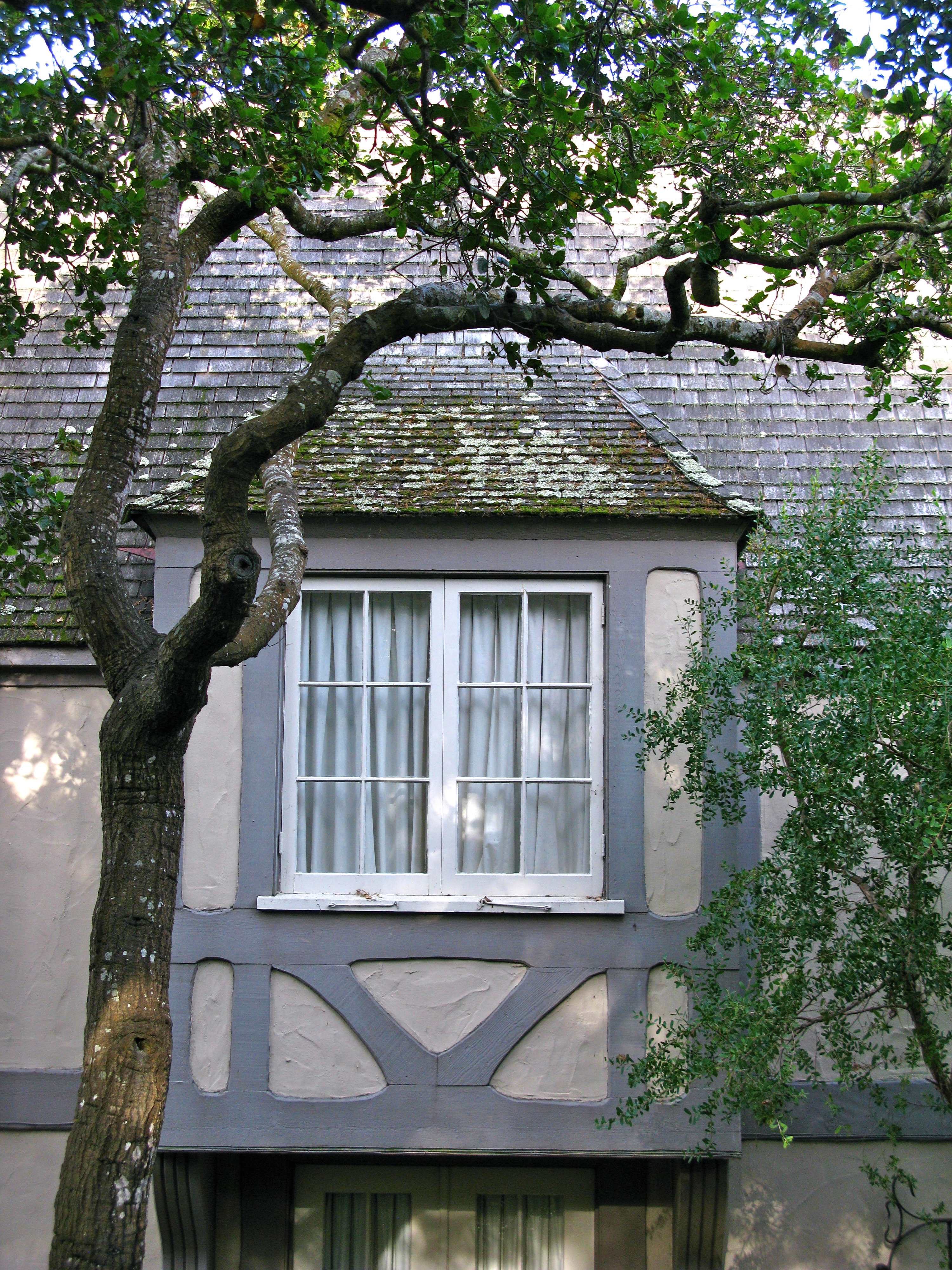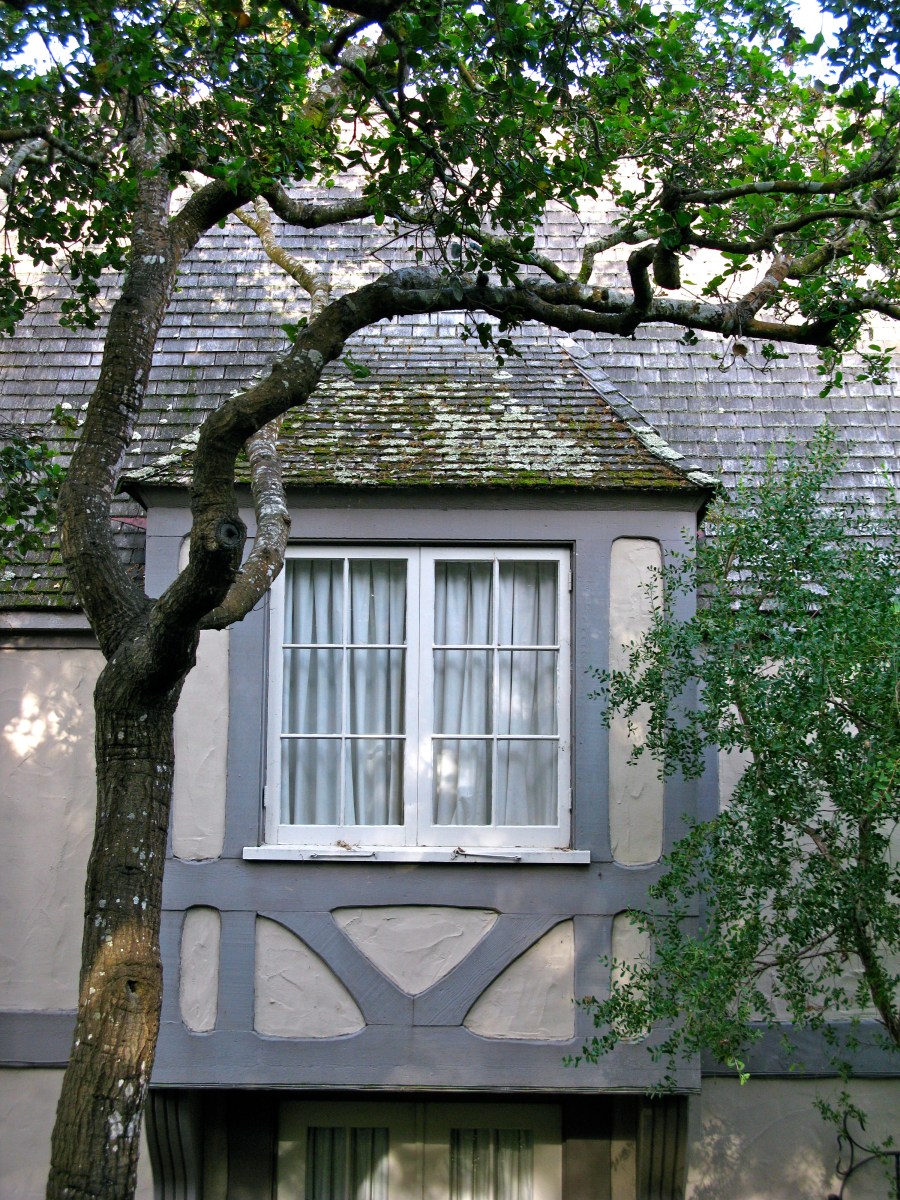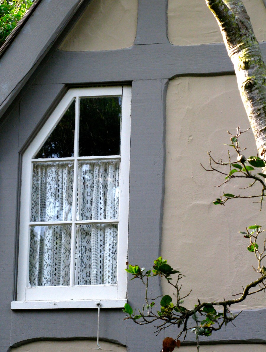 I scramble around in the bushes to see better. This results in a branch poking into my arm, some unknown plant blossoms in my hair, and a better view.   I love the way this window angles under the eves of that steeply pitched roof – a Comstock trademark.