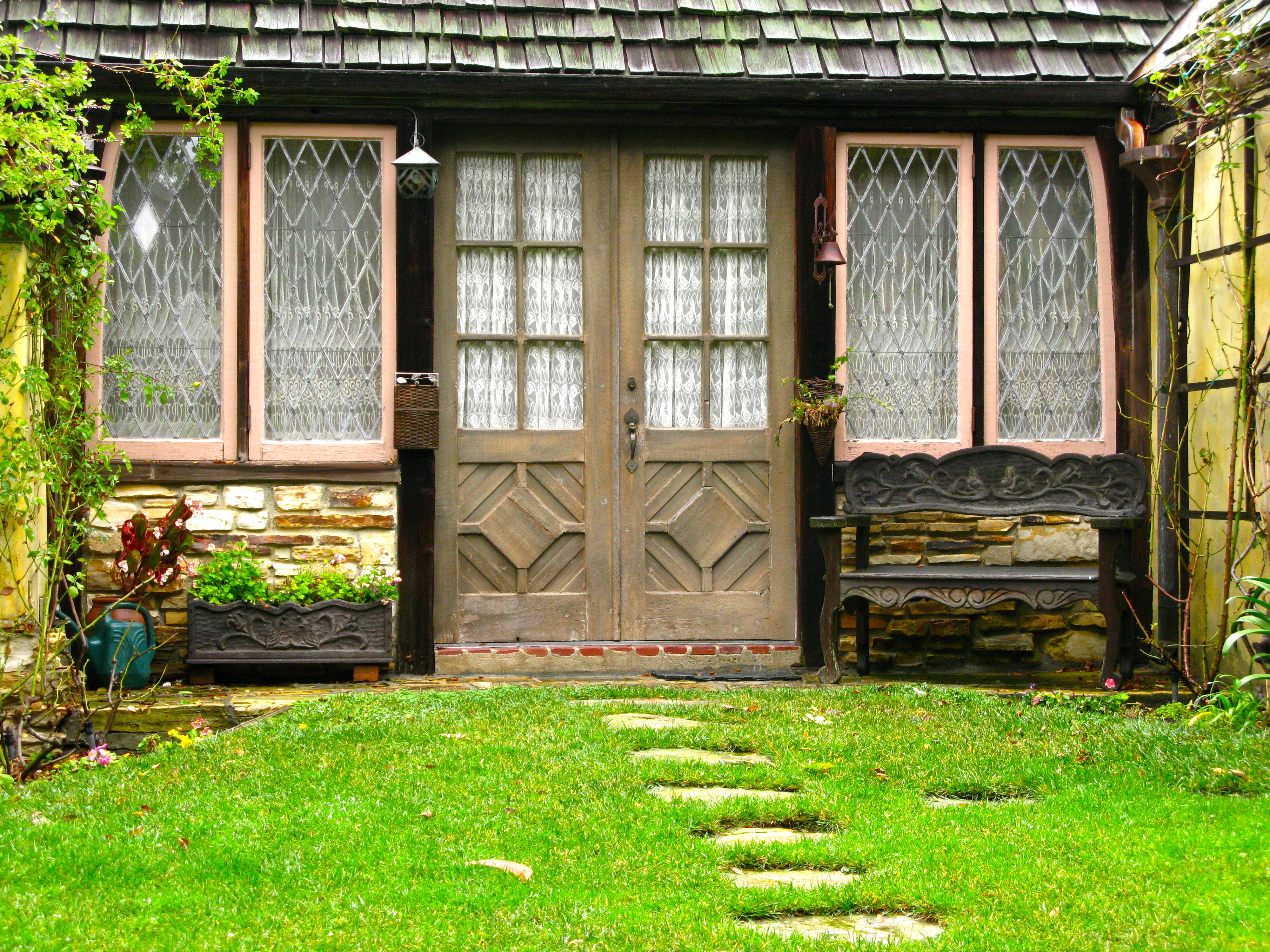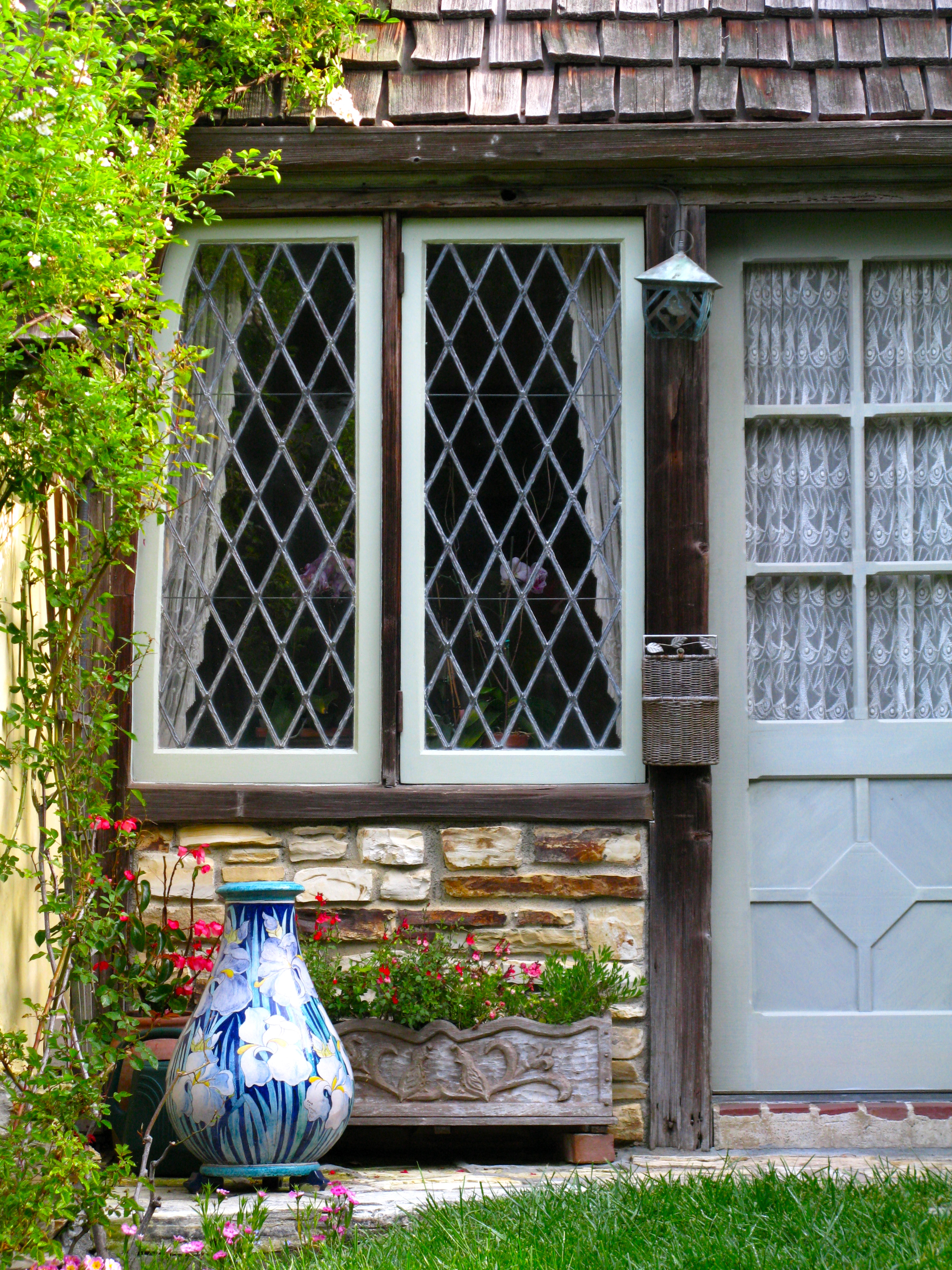 The west part shows off french doors with diamond shaped leaded glass windows. The doors open on the main patio. The wisteria is in bloom and Clematis “montana” is cascades gracefully over the roof. The chimney is another masterpiece fashioned of Carmel Stone.
