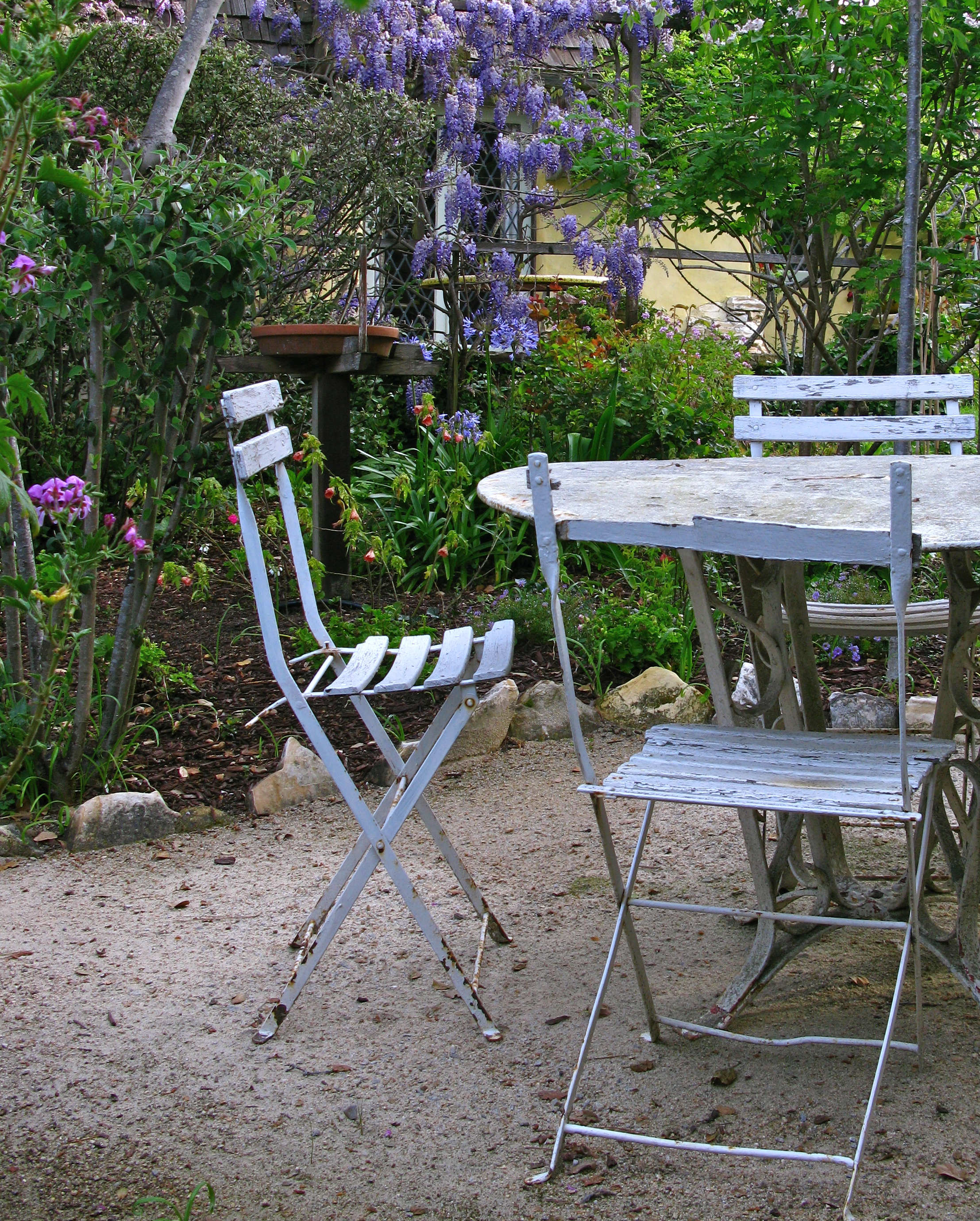 Wow! It looks like it was staged for a photoshoot with the wisteria in bloom. How nice to have your home photo-ready at any given moment. I love all the elements of the house, and even the lace curtains on the interior. Are those orchids inside that diamond pane window? I’d love to sit in those French bistro chairs and have my tea and scone!