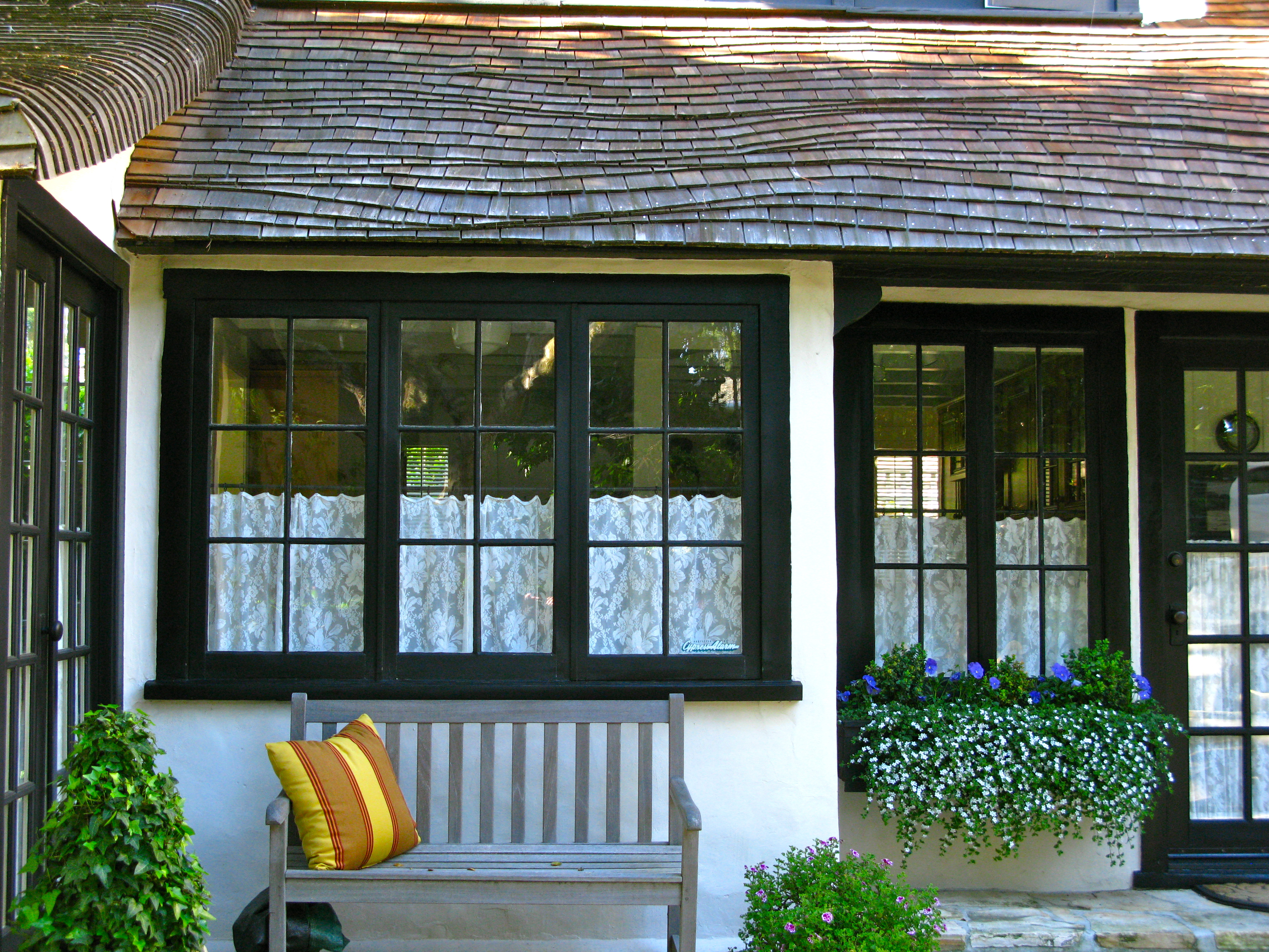 What a beautifully kept cottage. More teak furniture cushioned for comfort, flower boxes , planters and those great lace curtains make this so inviting.