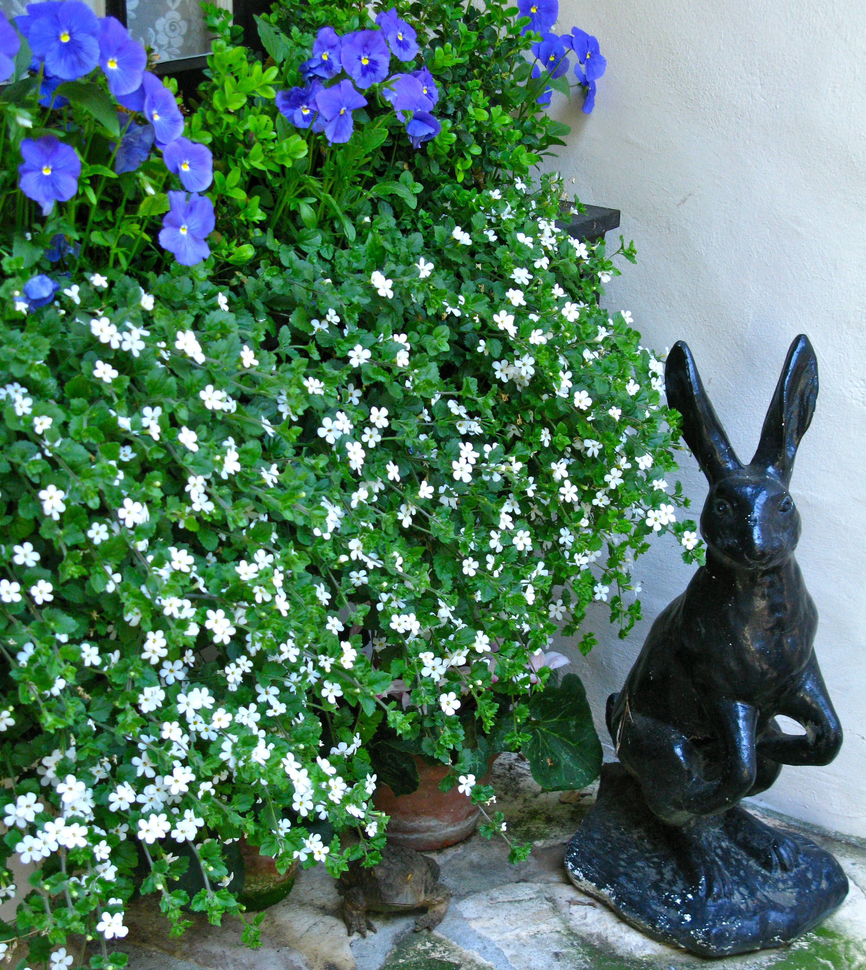 White bacopa is the plant spilling out from the planter. Ivy forms a topiary .