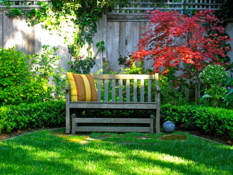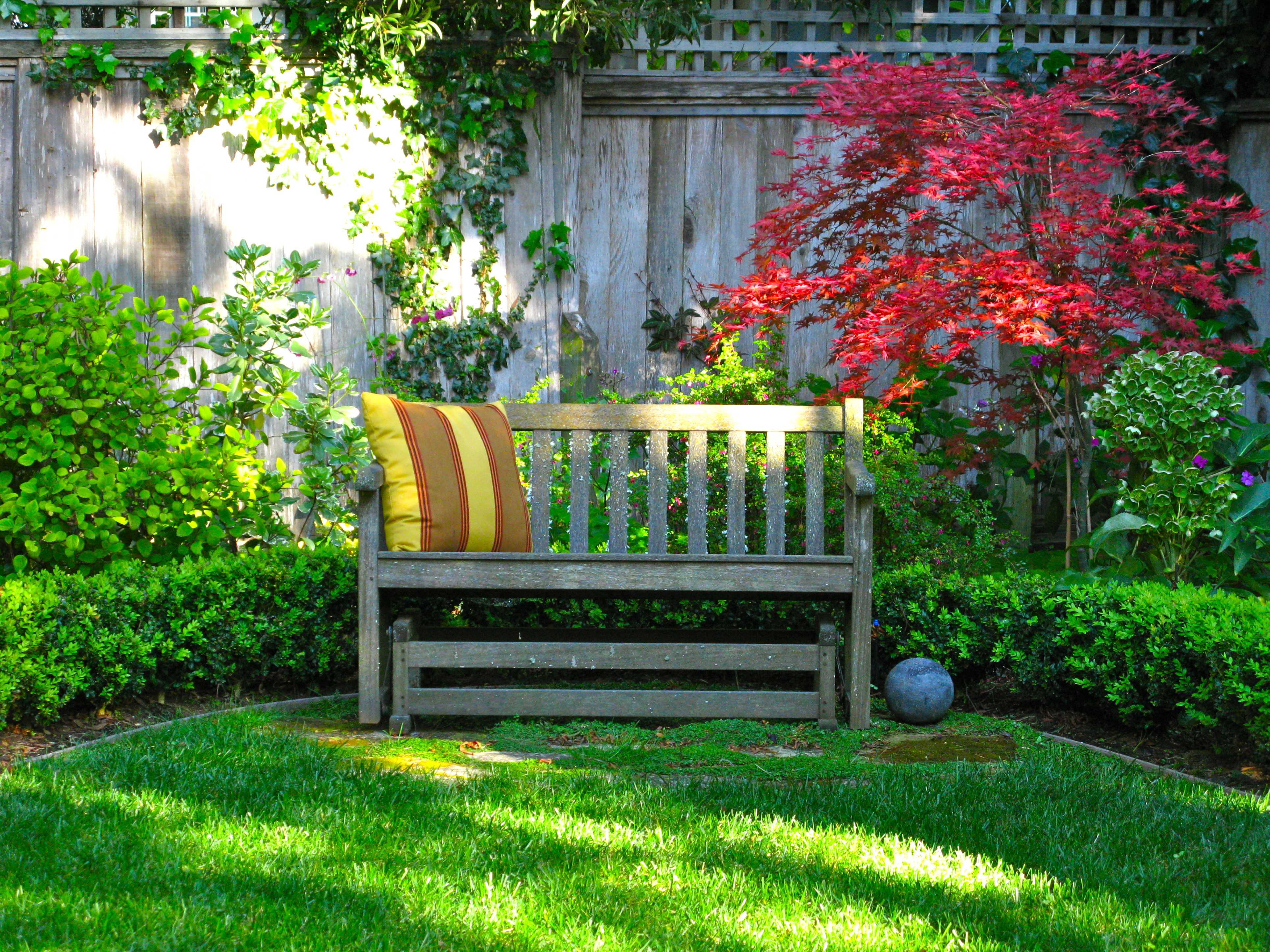This is the Feng Shui “power corner” and from this bench she can rock and survey her creation. Notice how skillfully she has used her touches of color.