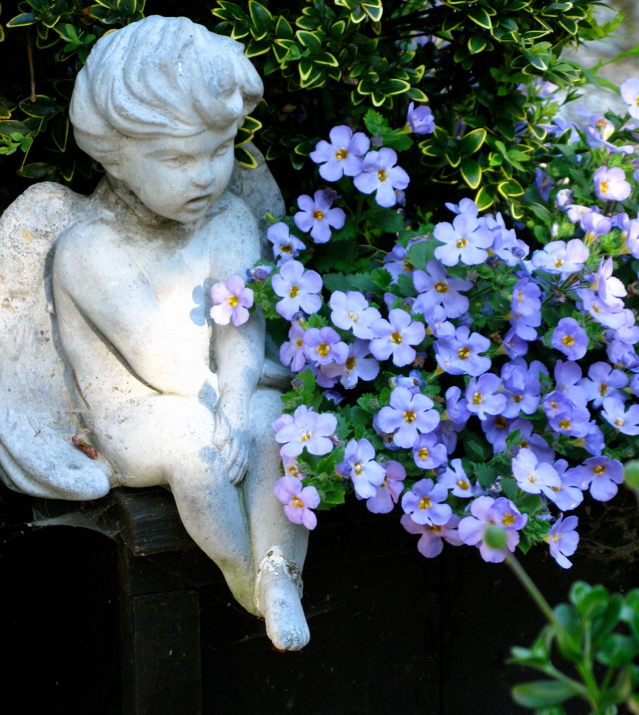 An angel perches on the edge of a planter of blue bacopa and variegated foliage.