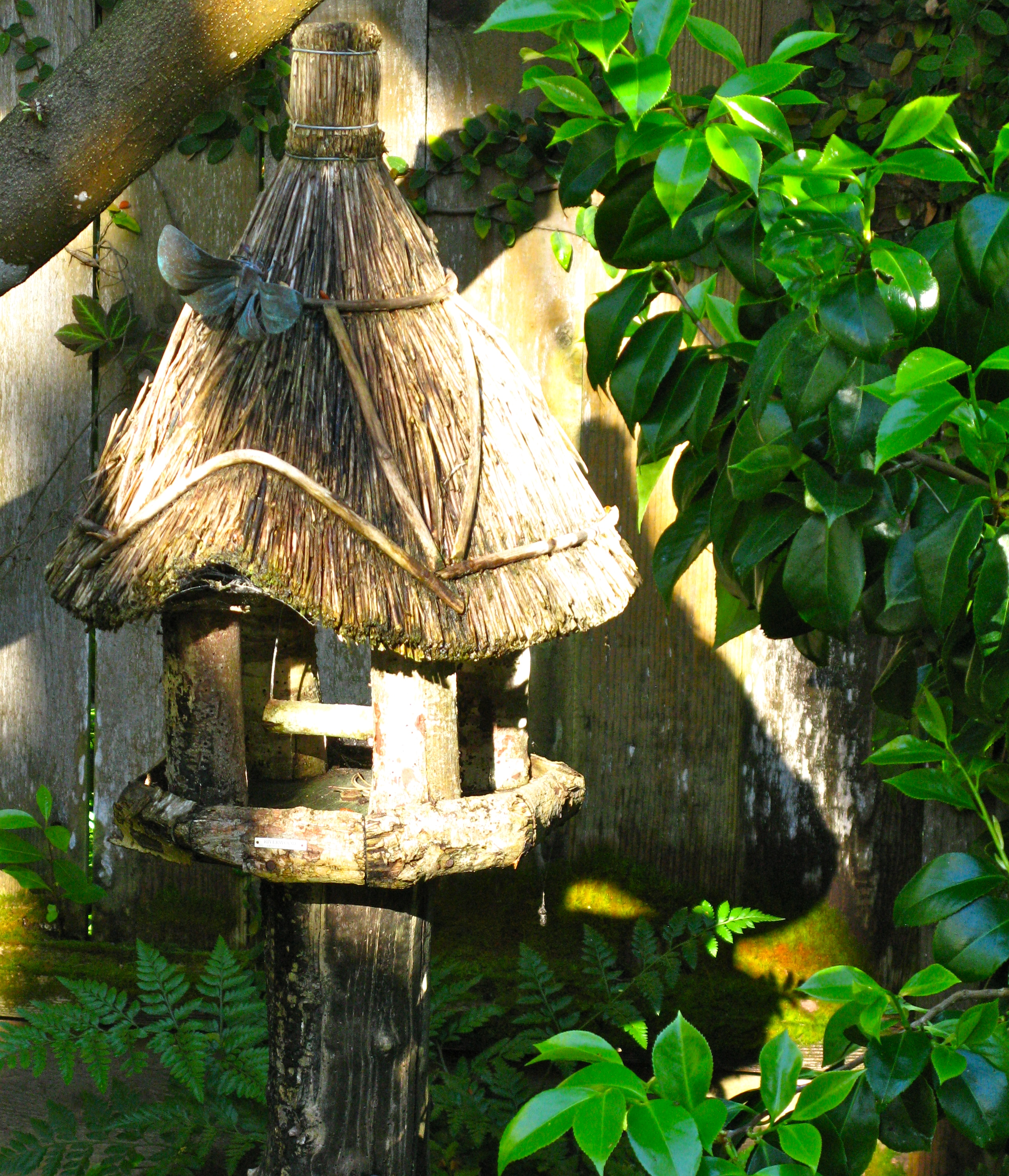 Her English Thatch bird feeder looks better than mine at home- where the squirrels have stripped off all the thatch for their nests. Check out the butterfly. She strikes just the right balance in her use of garden ornamentation.