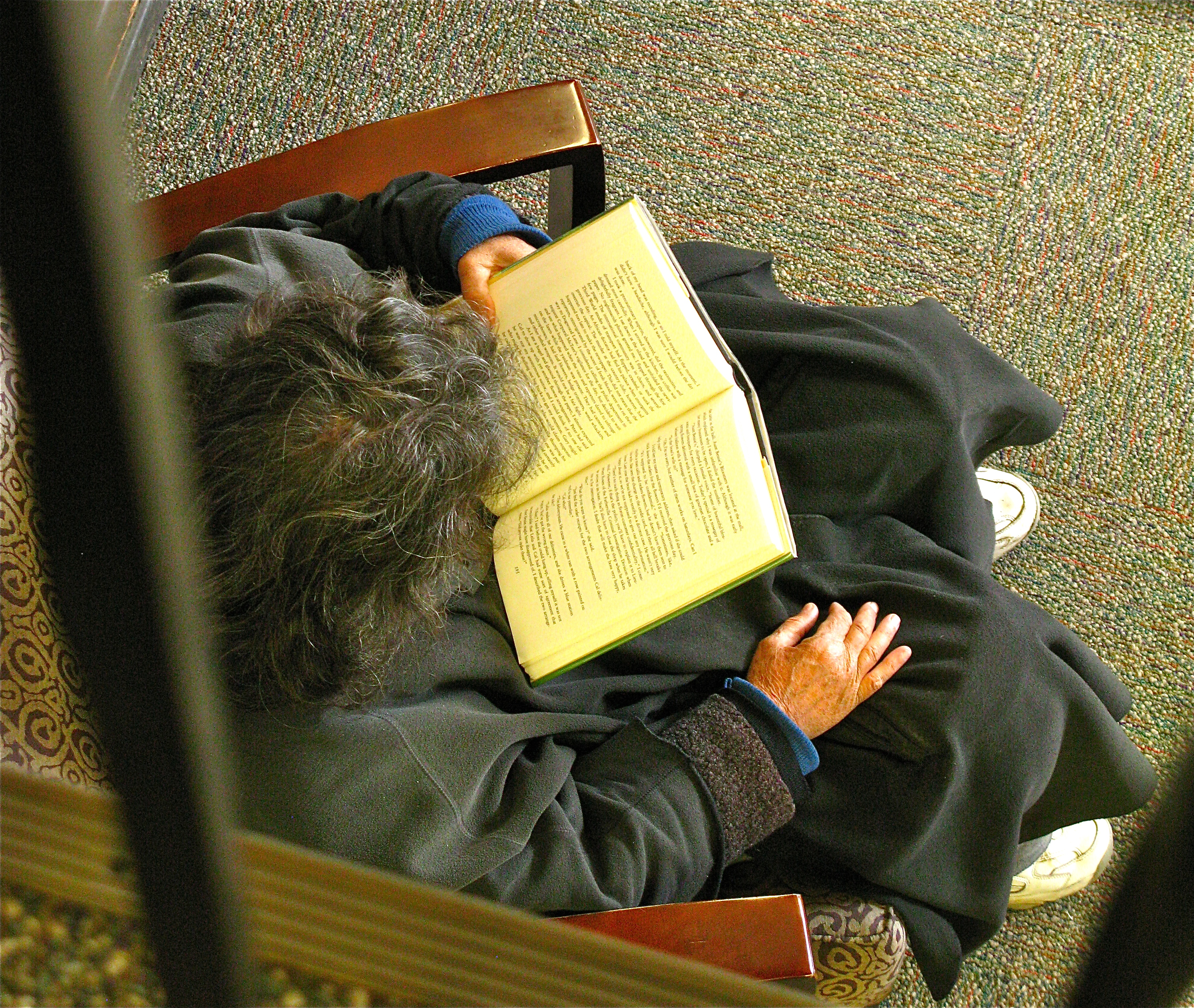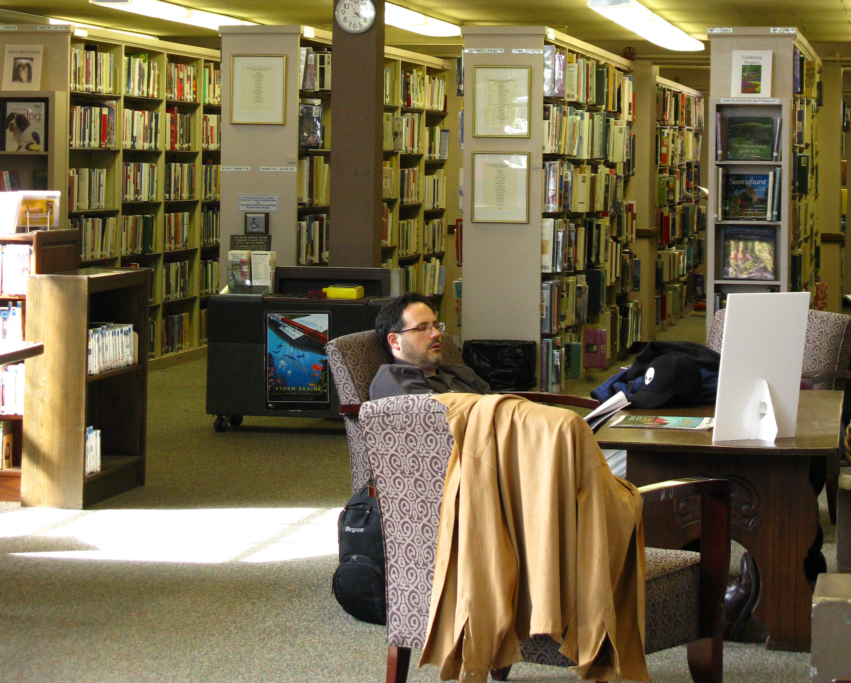 It is a stormy January day and I am feeling a little house-bound. While Bill tinkers with his latest project, I walk up 2 blocks for my first visit to the library. Lately, I am disappointed with my Kansas City branch library – it is all media and computers. As I step in the door I glance to my right and rewarded by the view of a spacious, light filled reading room .