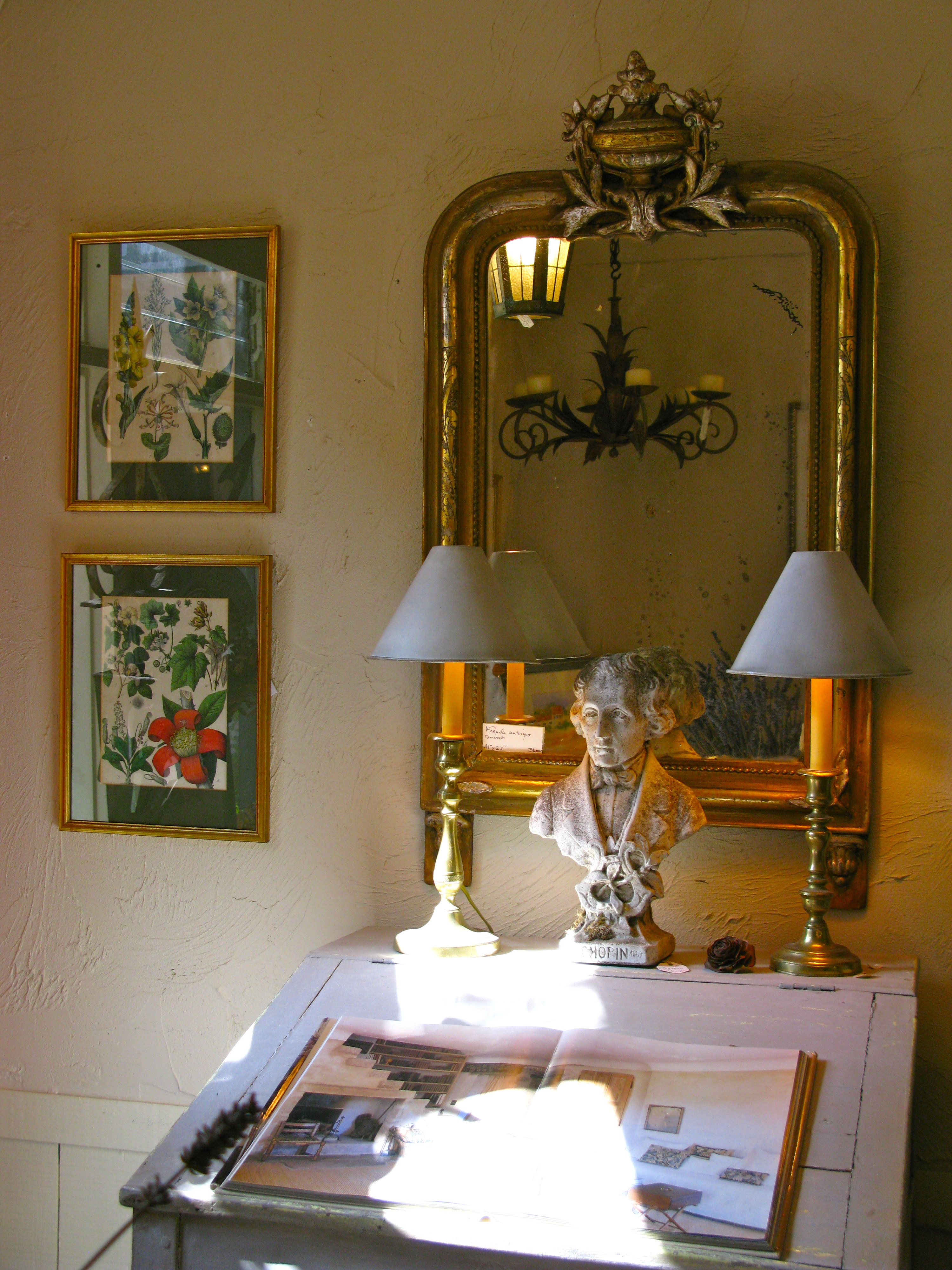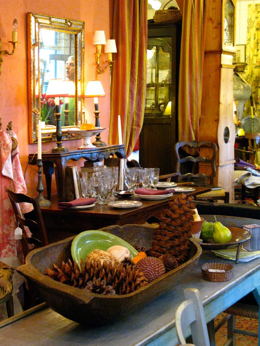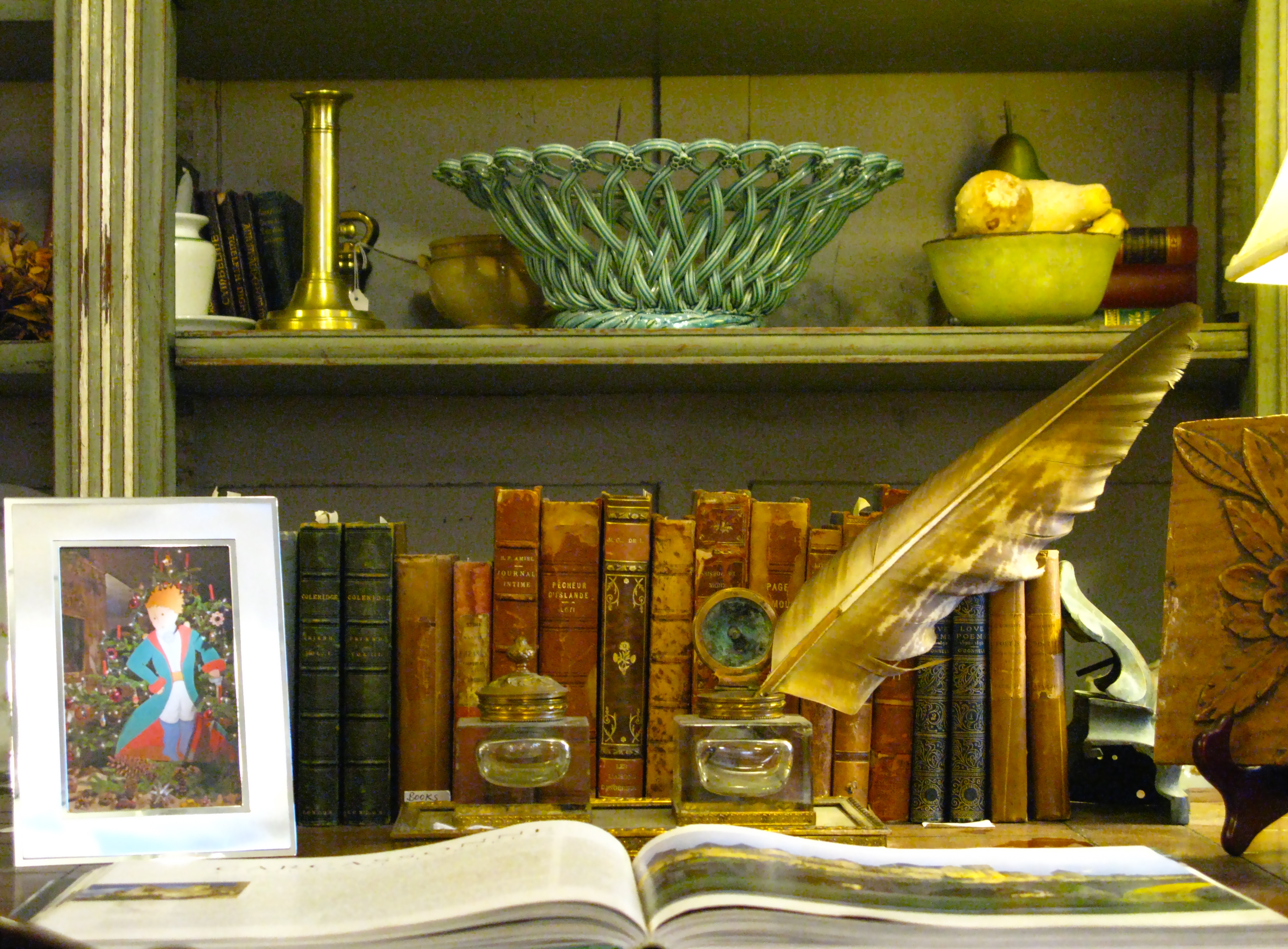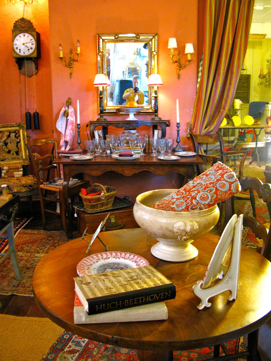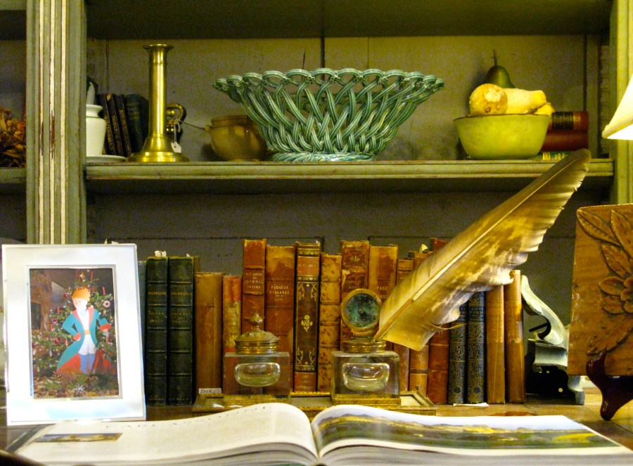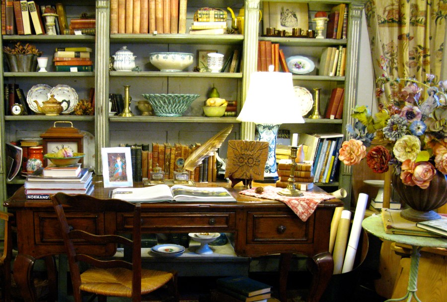 She arranges her shop in delightful vignettes so that the pieces tell a little story. This area with the desk, books and writing accessories is particularly charming.