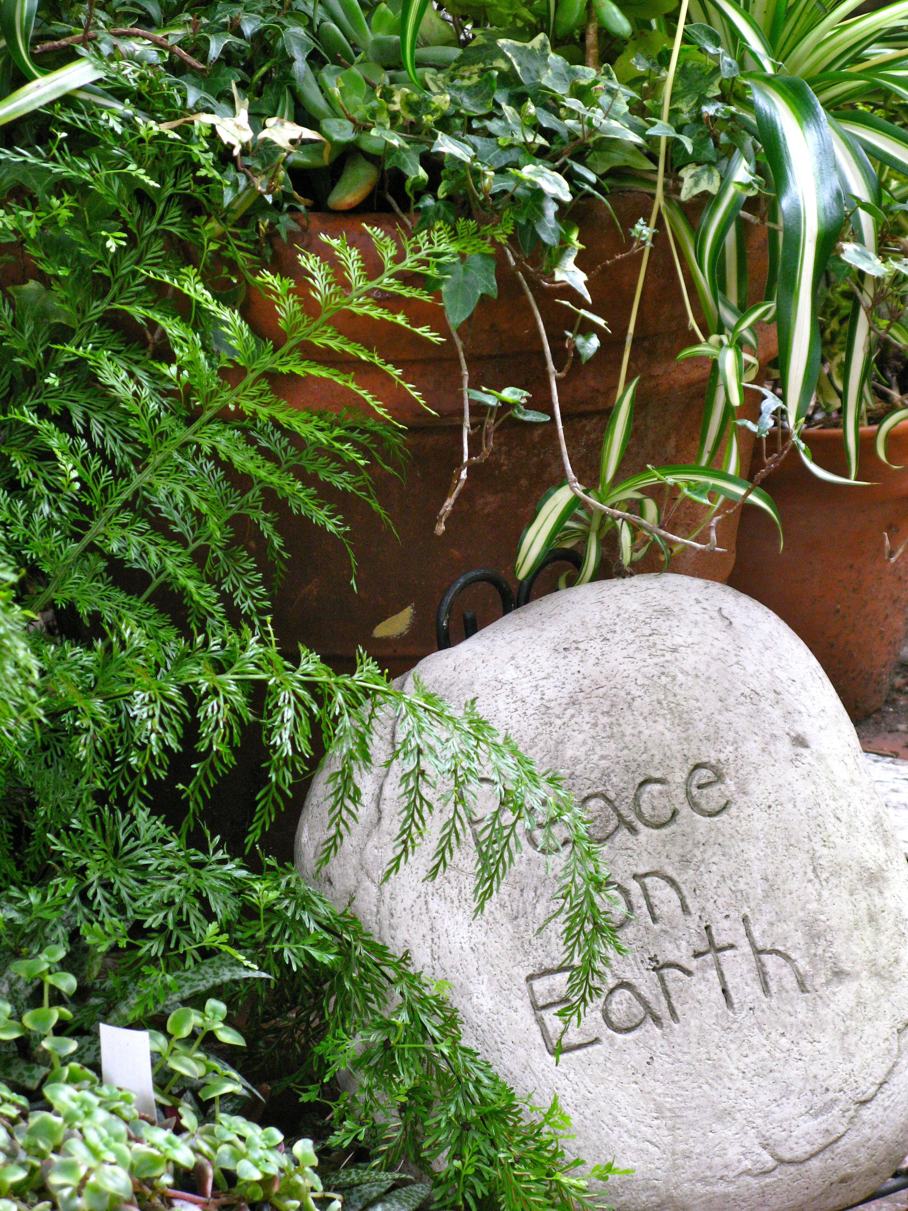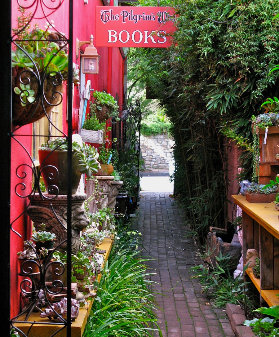Can it still be a secret? Nevertheless, I love the Secret Garden walkway and courtyard next to The Pilgrim’s Way Bookstore. They are both owned and operated by Paul Fridlund and Cynthia Fernandes. They have created a lovely spot in the Secret Garden. I walk down the passageway admiring the pots already planted by a local designer.