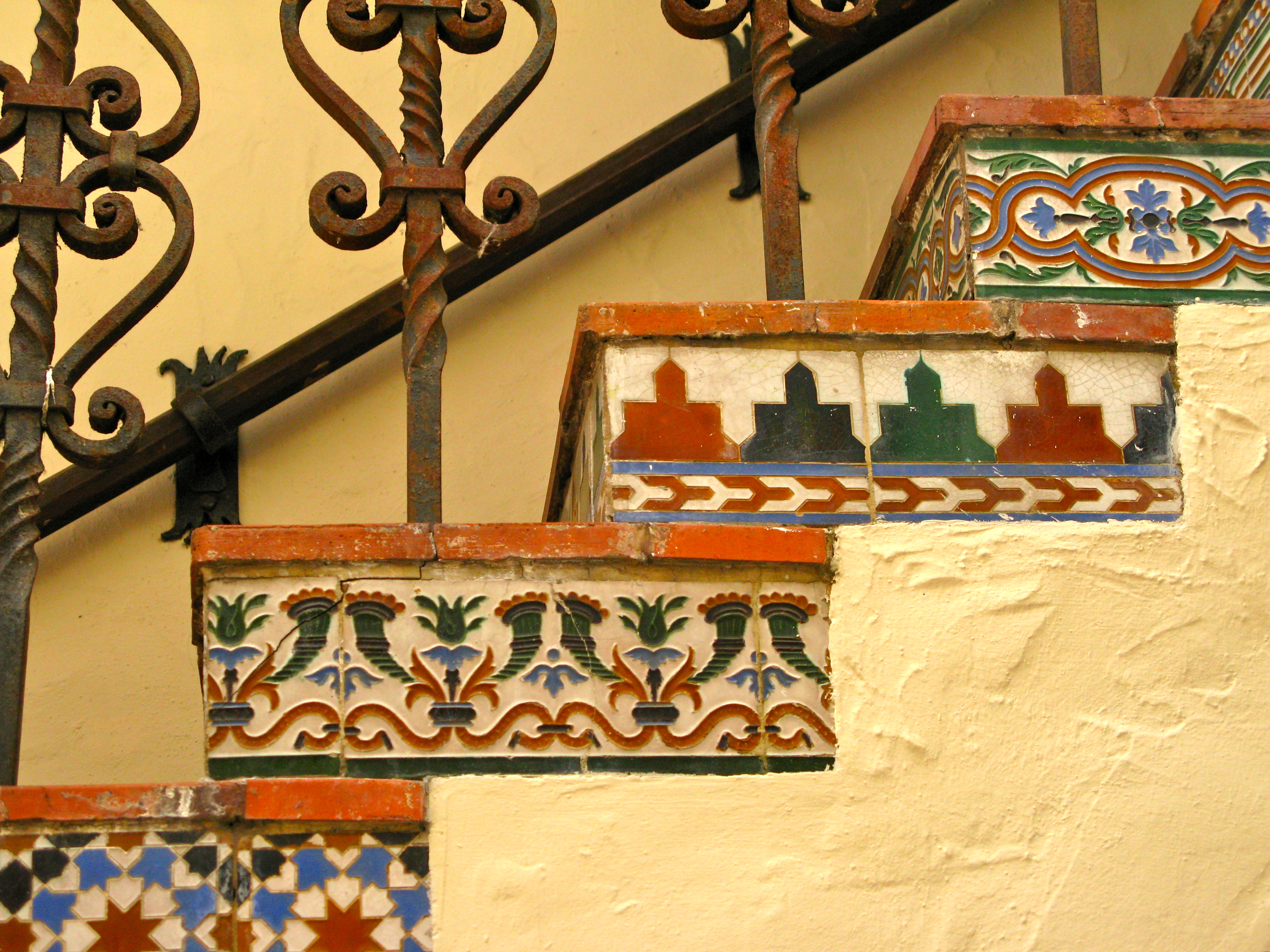 The tile that has 3 little chips out of the face, is Tunisian Tile, made by Jacob Chemla, in the city of Tunis. The chips are part of a tile making process that goes back to Ancient Persia. The tile on the staircase are Menasque tile, from Spain. Cuenca technique. Many of these tiles were also used at the Jackling Mansion in Woodside. George Washington Smith Architect. Demolished by Steve Jobs. I saved all the tile.