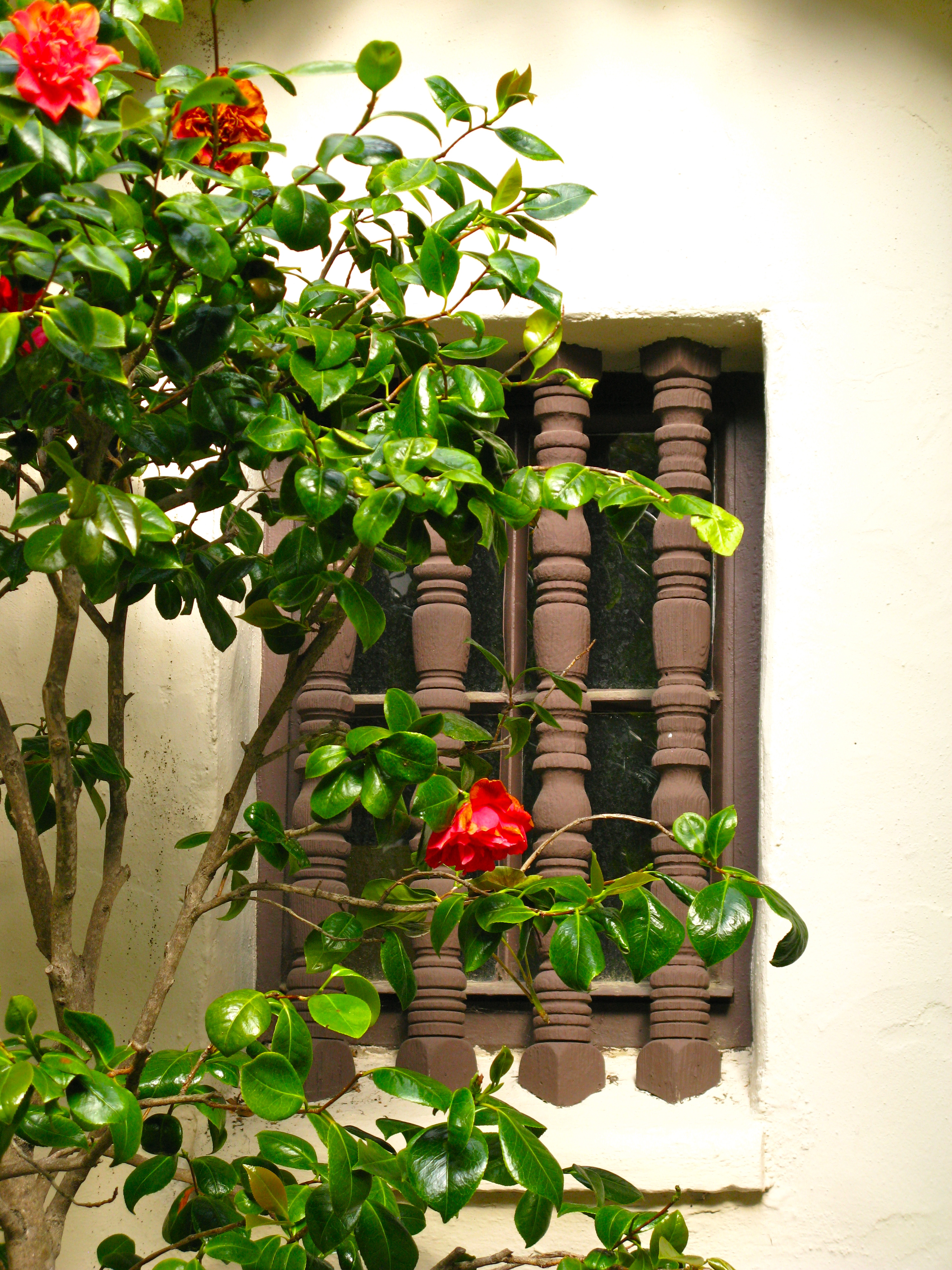 The camellias are blooming. Chairs and a bench await the evening when they will be rearranged for al fresco dining.