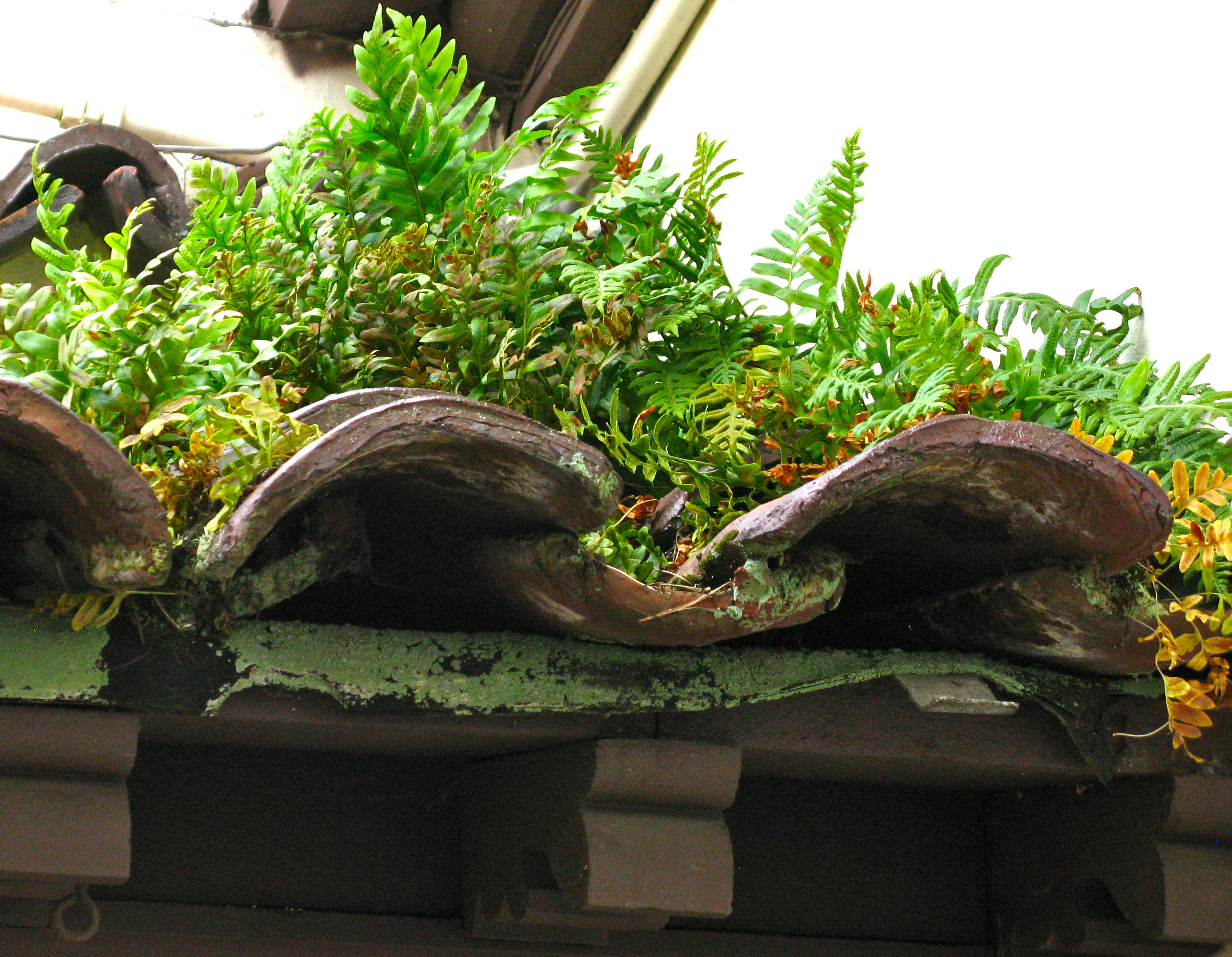 as is the tiled roof. A colony of ferns has decided that this is the perfect place to grow.