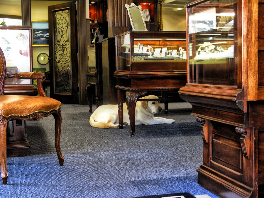 I take right turn out of the court and pass Fourtane Estate Jewelers. A golden Lab regards me from her sunny spot.
