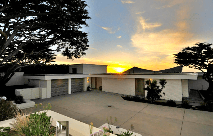 It is a one-story , mid-century Modern residence that sits on a rock outcropping above the Pacific Ocean.