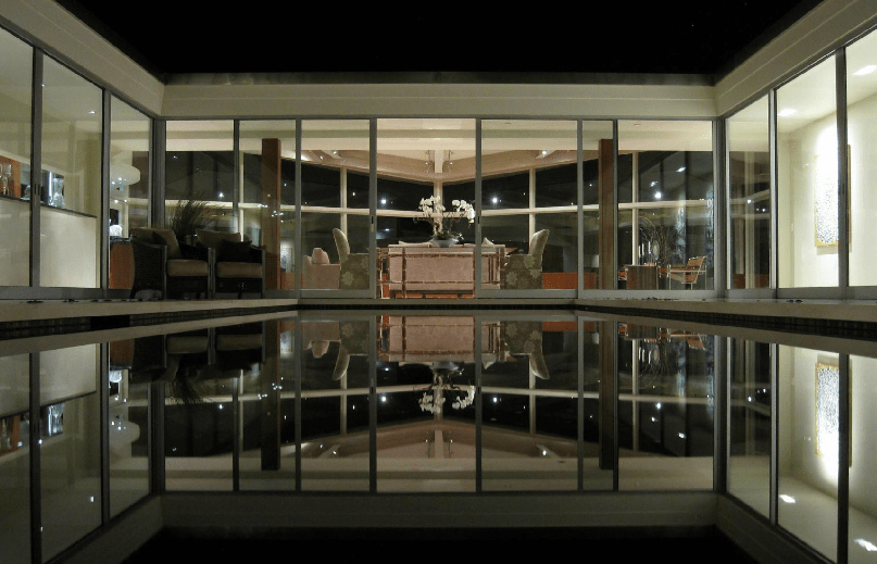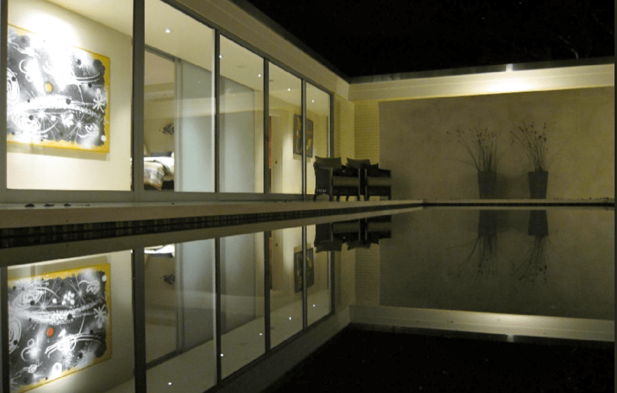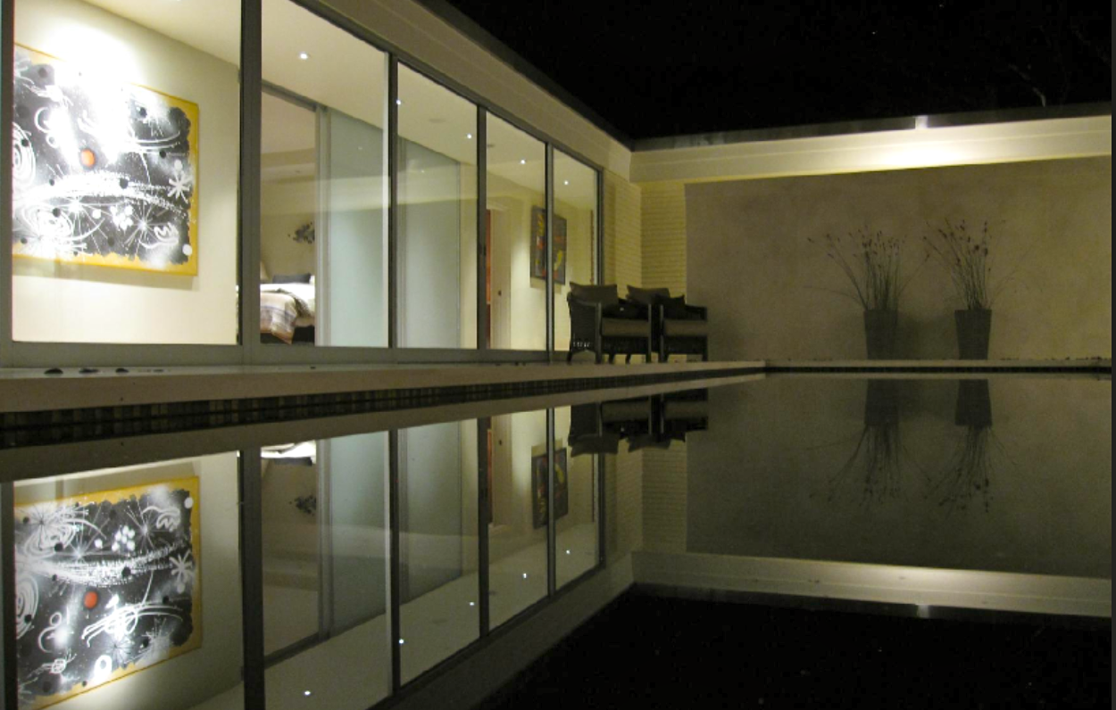An interior courtyard hides a lovely swimming pool. The pool seems a work of art to me both at night