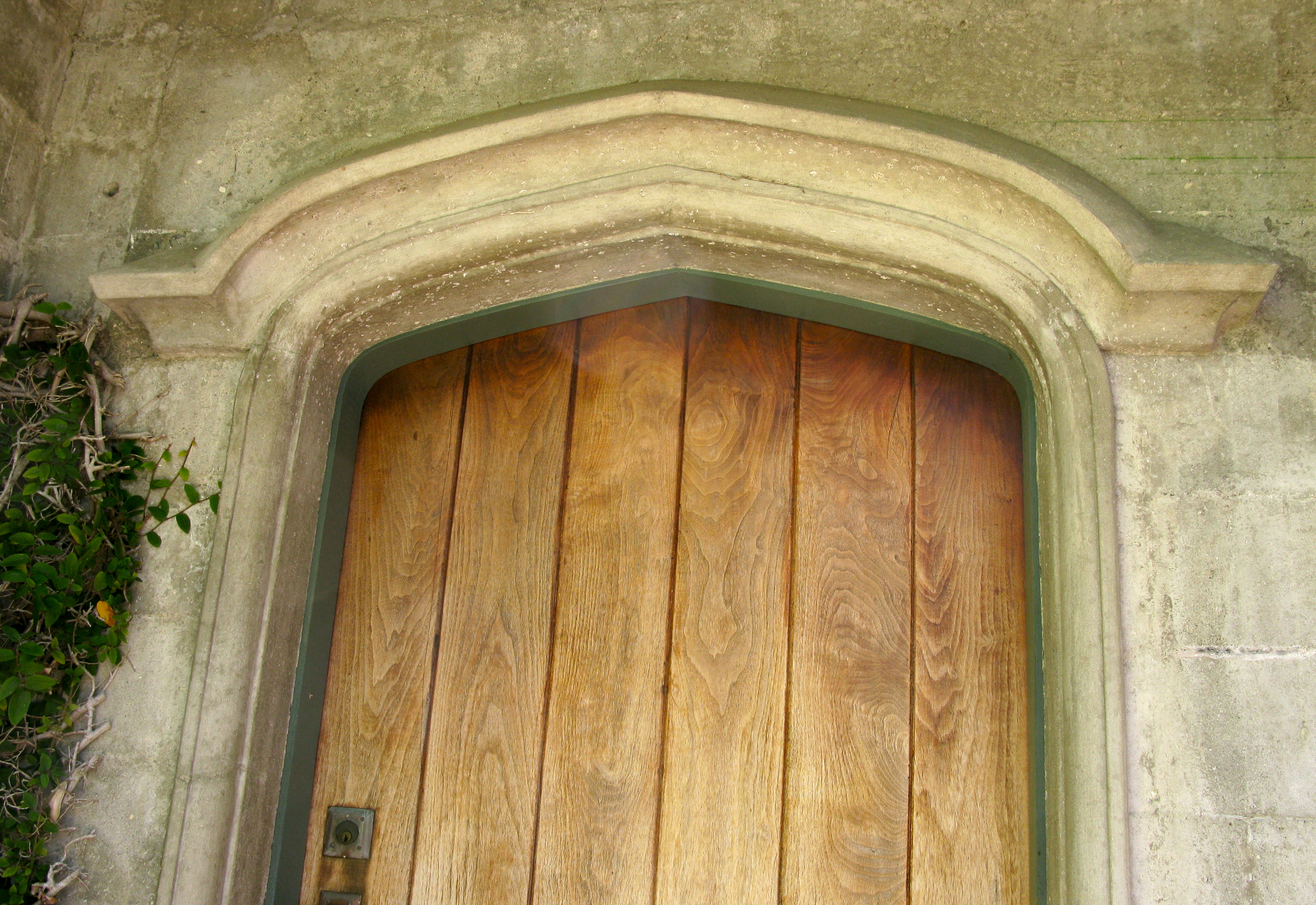 The handsome front door sits in ivy covered walls