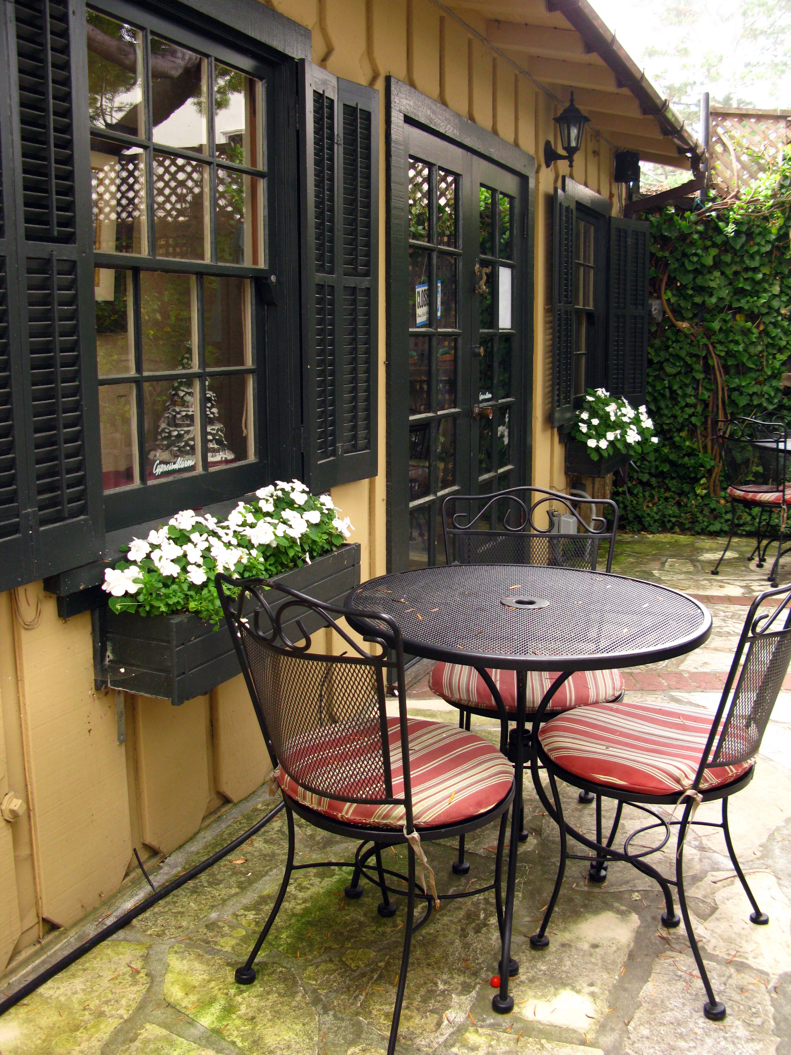 In front of me I see a small yellow shop with and inviting patio complete with cafe table,