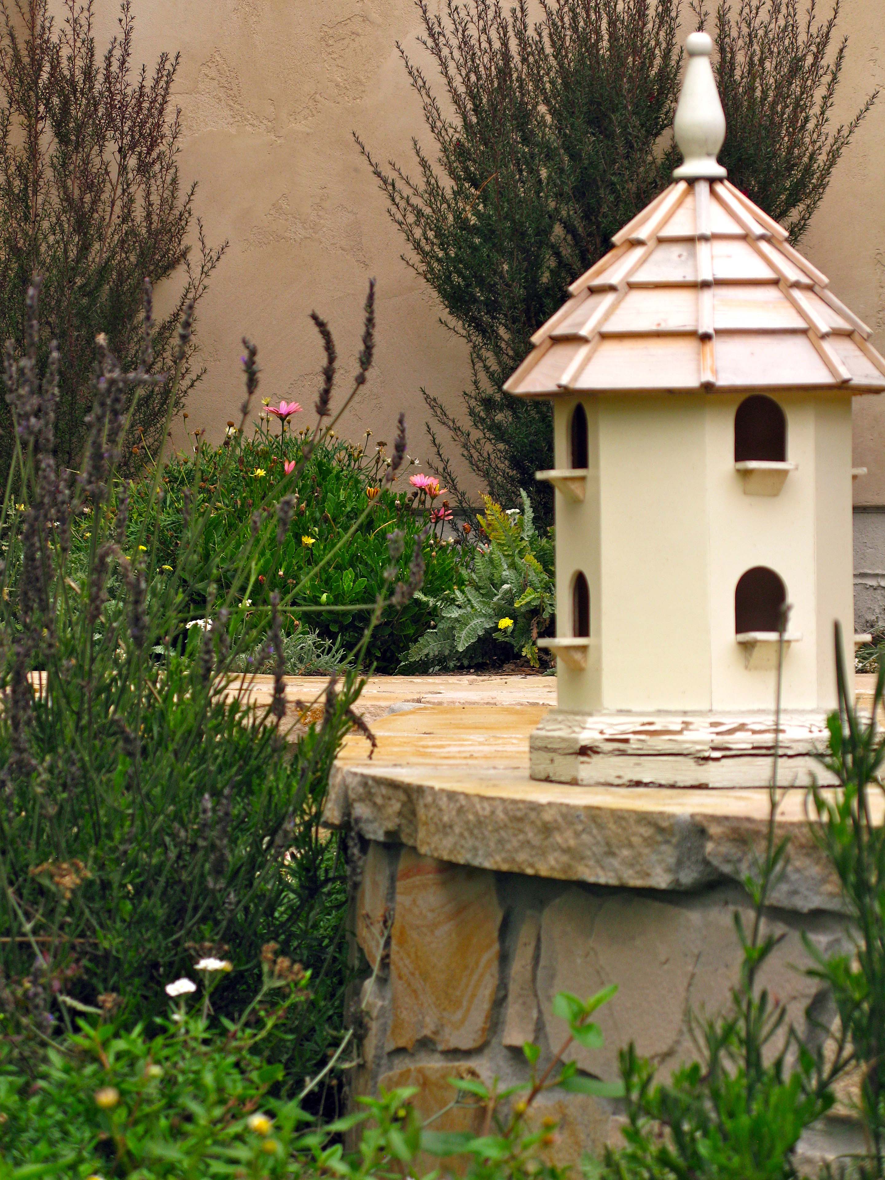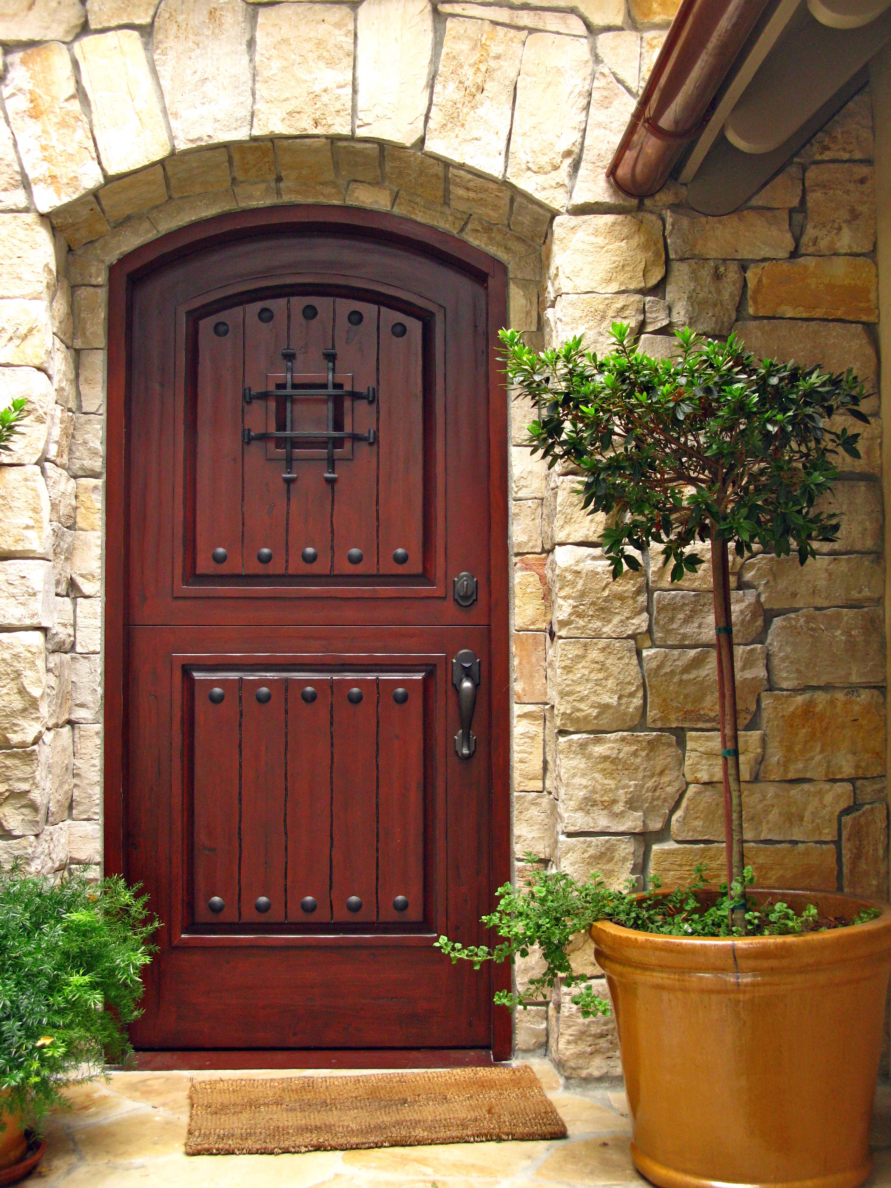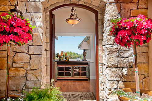 The path is Carmel stone and the front porch is a treasure of fine  wood, details and potted plants.