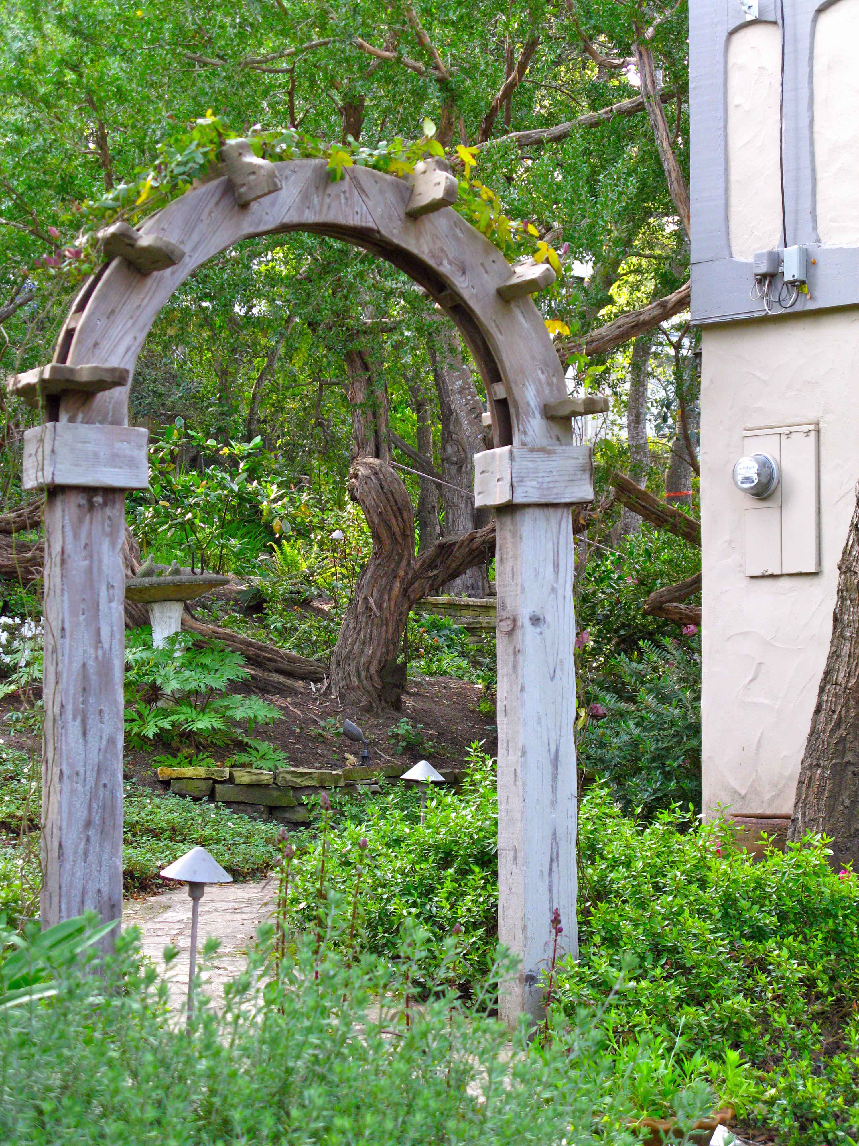 A sturdy wooden arbor forms an entrance to entice us down the path.