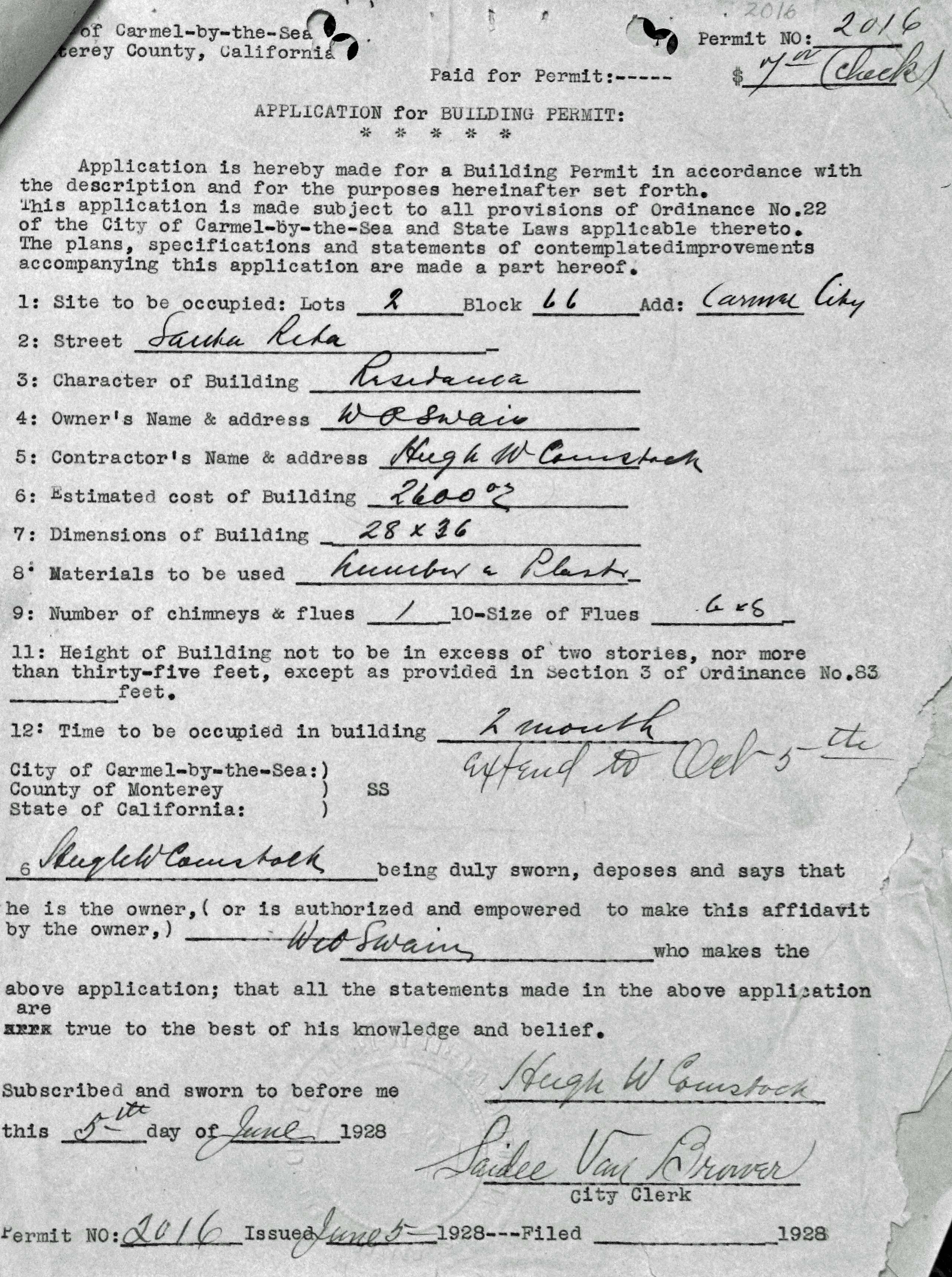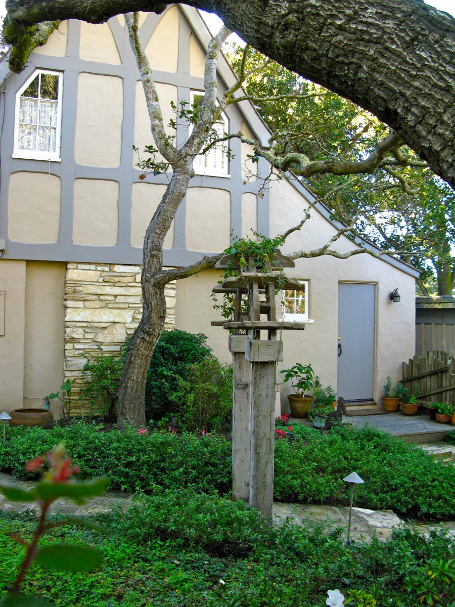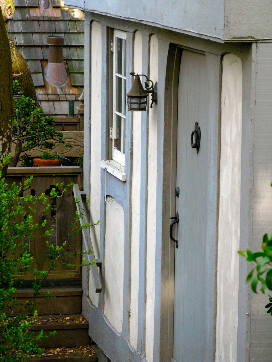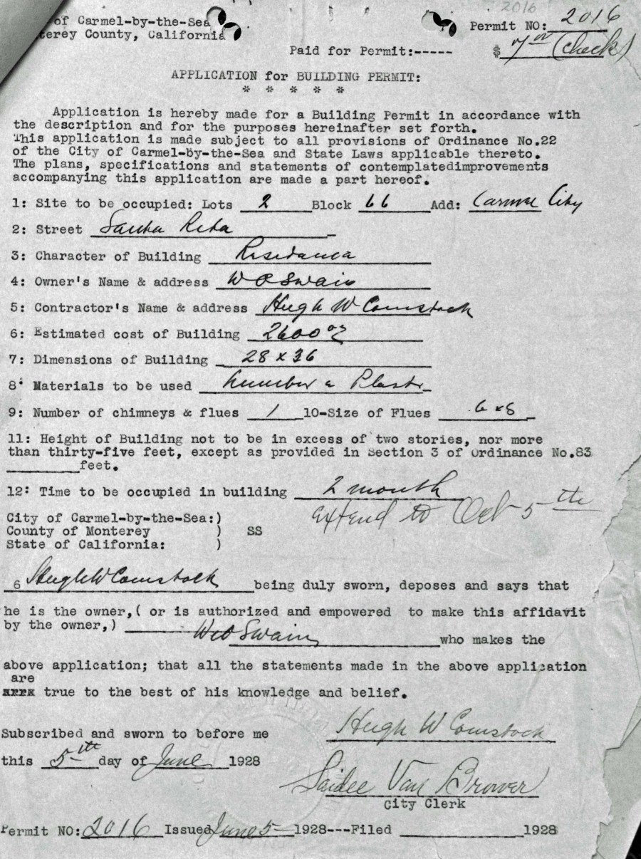 In 1928 , eastern investor, W.O. Swain convinced The Carmel City Council to allow him to develop a small, five-unit subdivision based on the English garden city plan.  Mr. Swain rearranged his lots and the cottages so that instead of standing on narrow wedges, city fashion,they would be grouped together with a feeling of spaciousness about them as in a park. He shortened and widened the lots. And he ask Hugh Comstock to build them. The five houses form the largest single concentration of Comstock fairy-tale cottage left in Carmel.