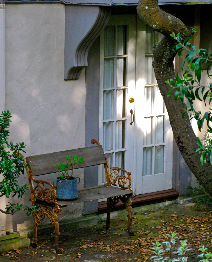 The owner has found a  wood and iron bench to place outside the doors.