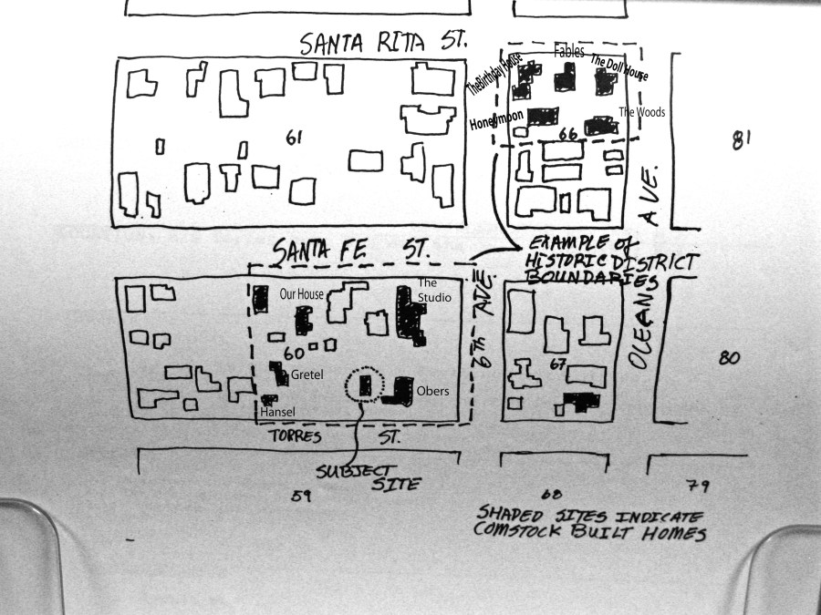 The Birthday House anchors the corner of Santa Fe St and Sixth Ave. It is the last of the five cottages in this Comstock “cottage complex” and the largest. It is a whopping 28’x 36’. Hugh estimates it will cost $2,600 to build.
