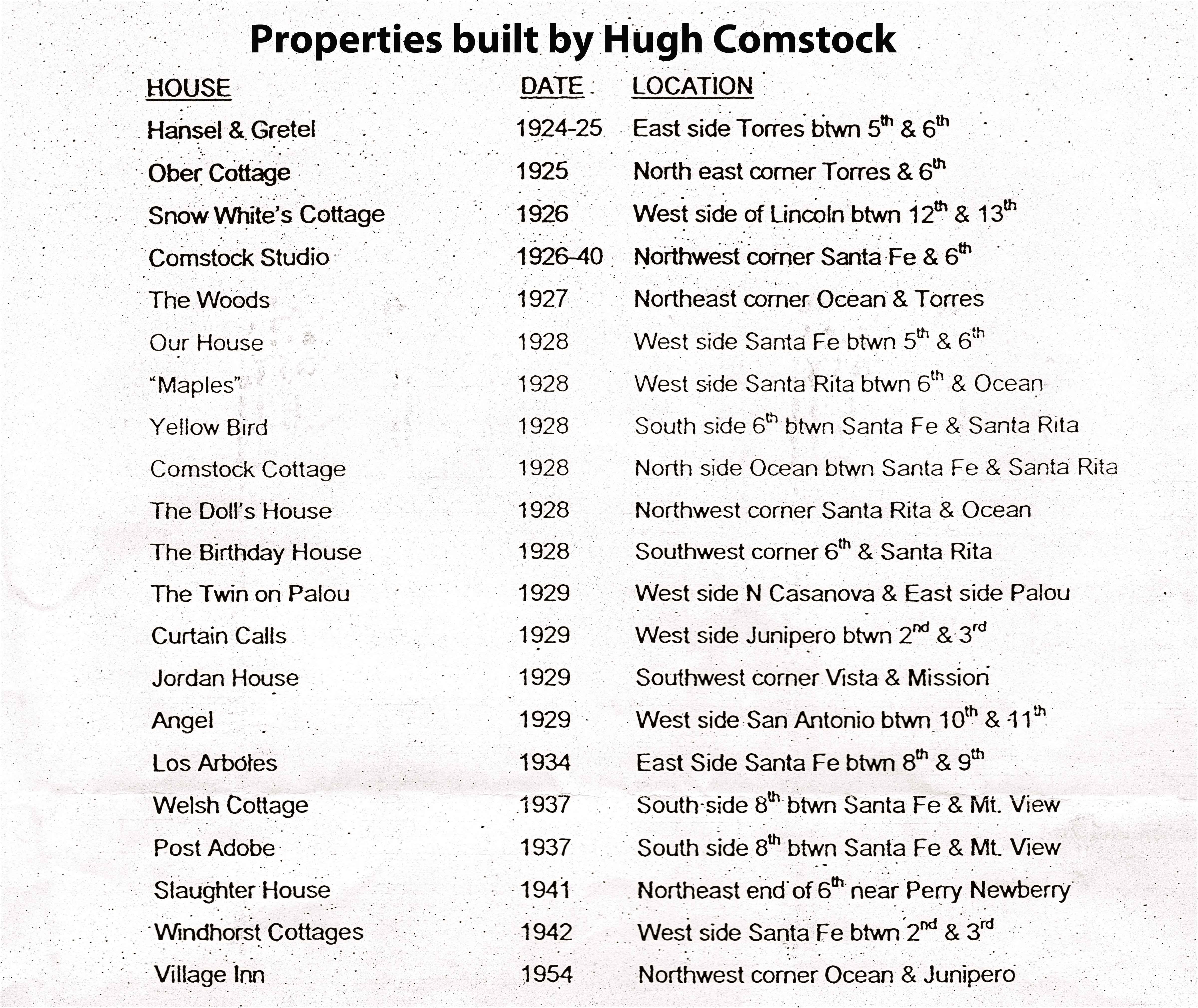 So many of us want to know the locations of the Comstock Cottages. This is the list the Visitor’s Center hands out with the reminder that all are occupied and their residents’ privacy need be respected.