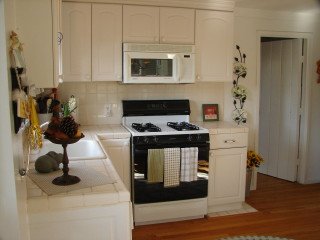 The tiny kitchen has a dutch door that opens to the west, cooler, sink and dining nook.