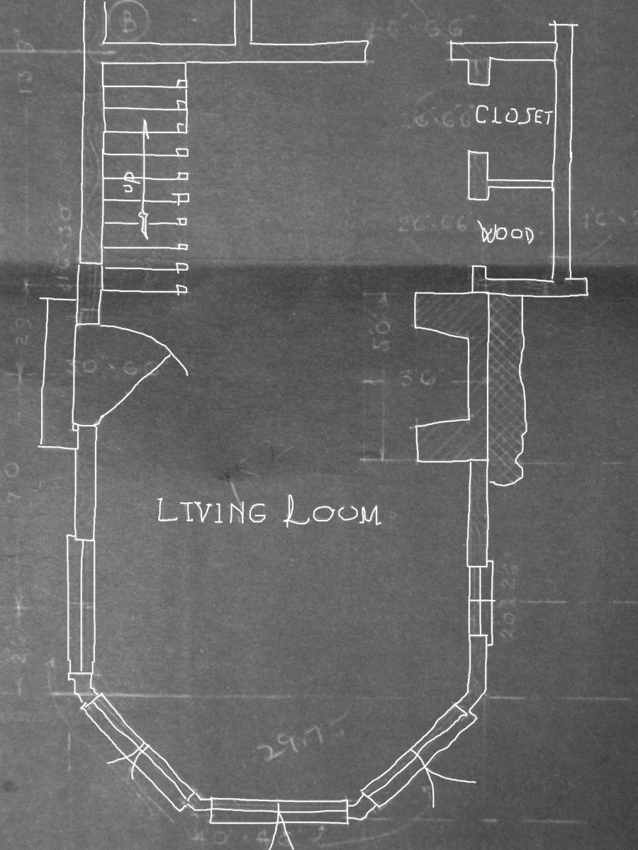The living room is two stories high and graced with the huge bay window.  I find the floor plans at City Hall and include them here for us. The first floor is the living room with its inviting fireplace and practical wood box.