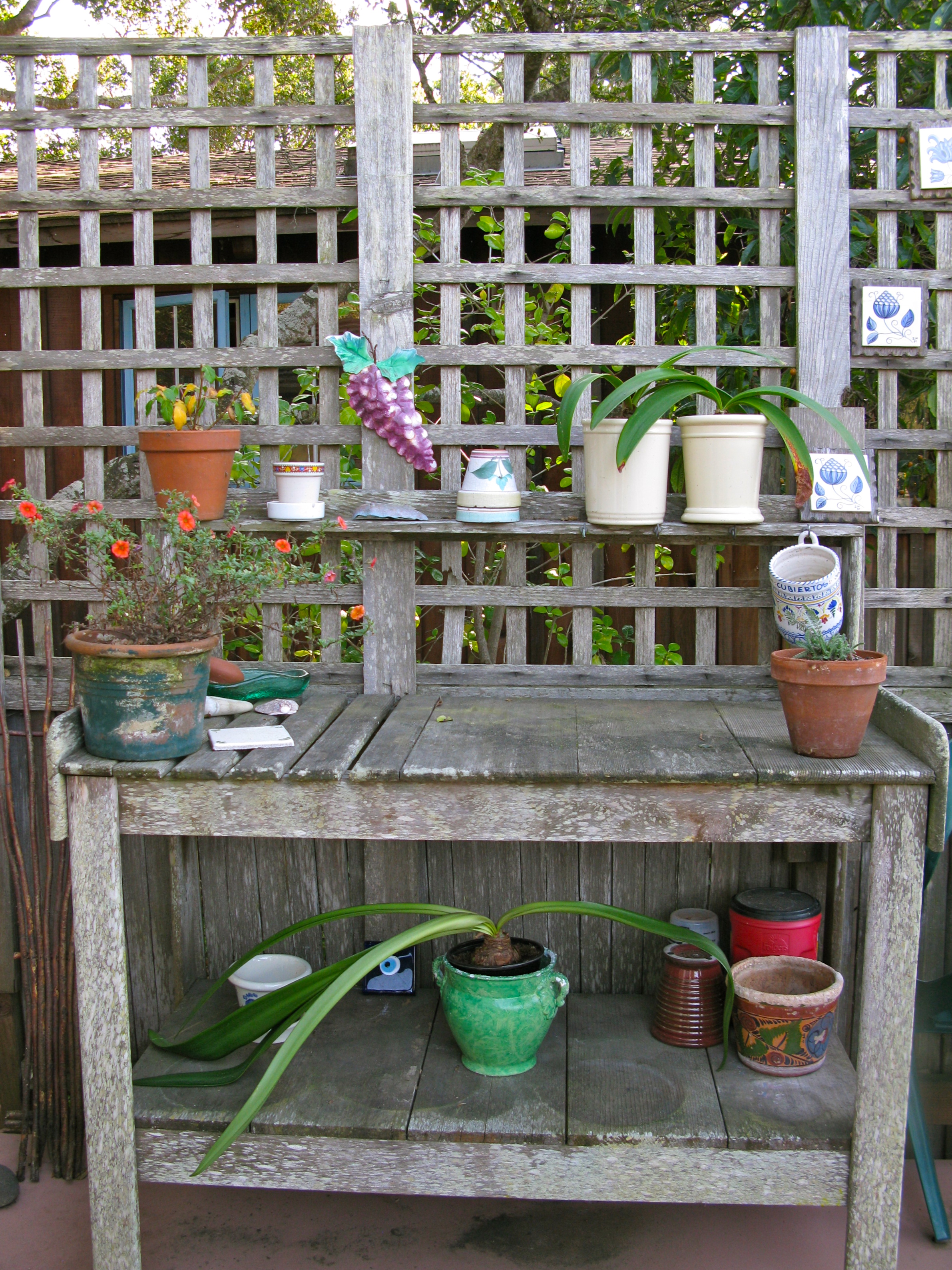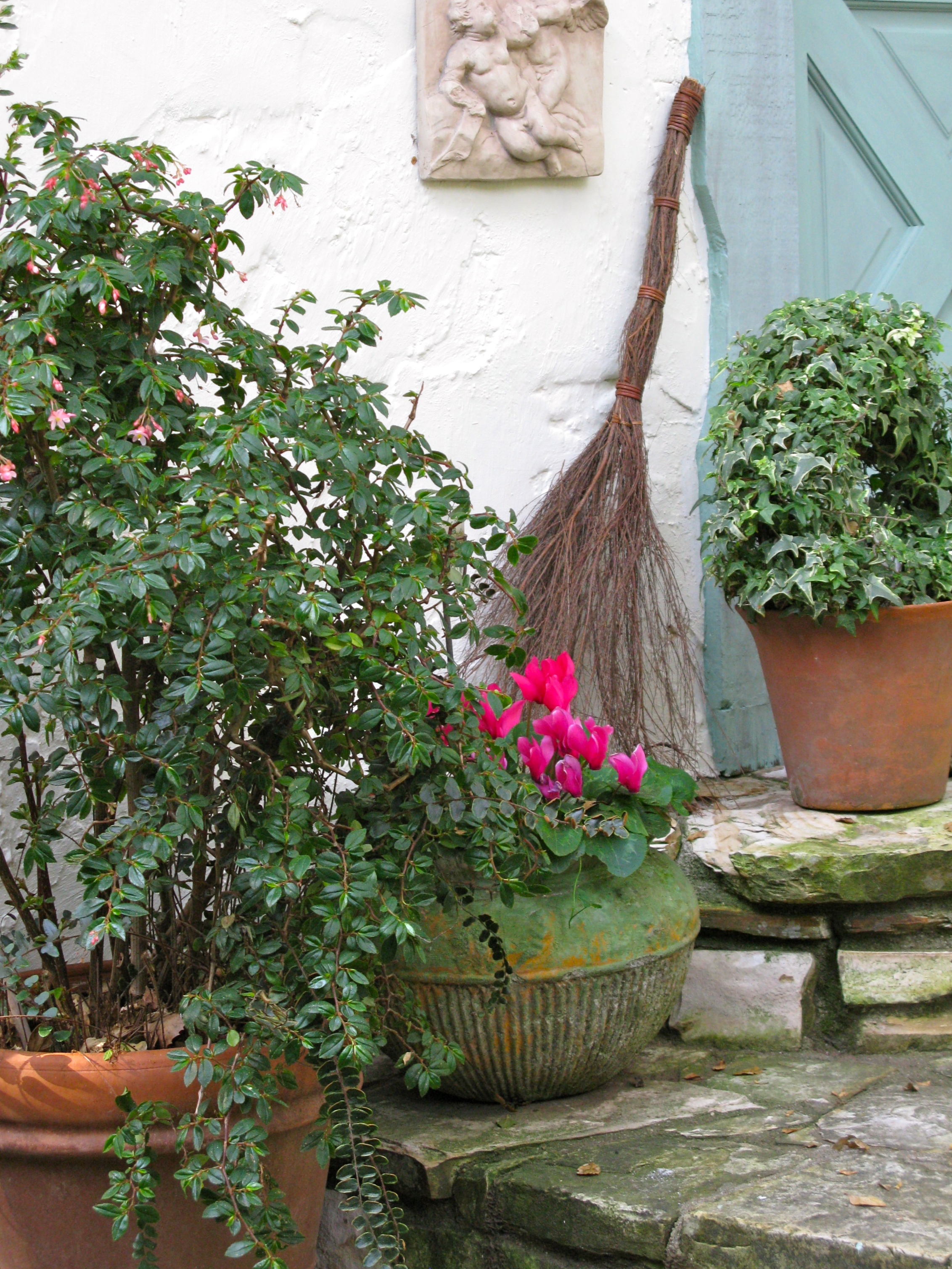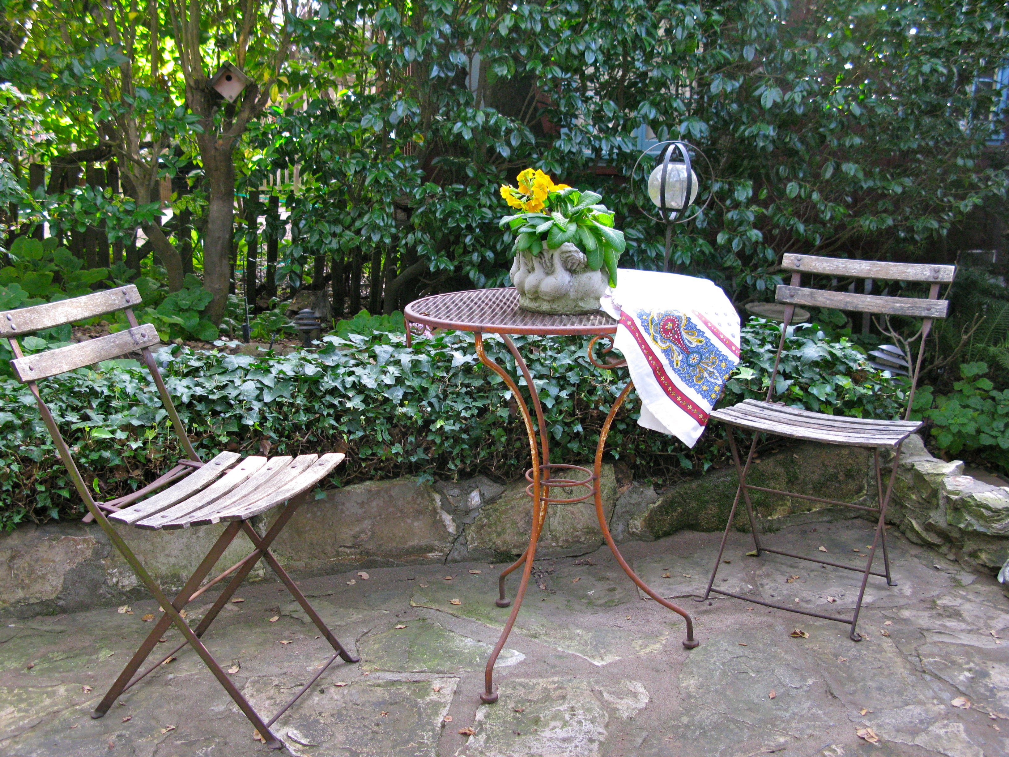 Mary leads me outside to the garden. Two doors open to this patio space.  The front door