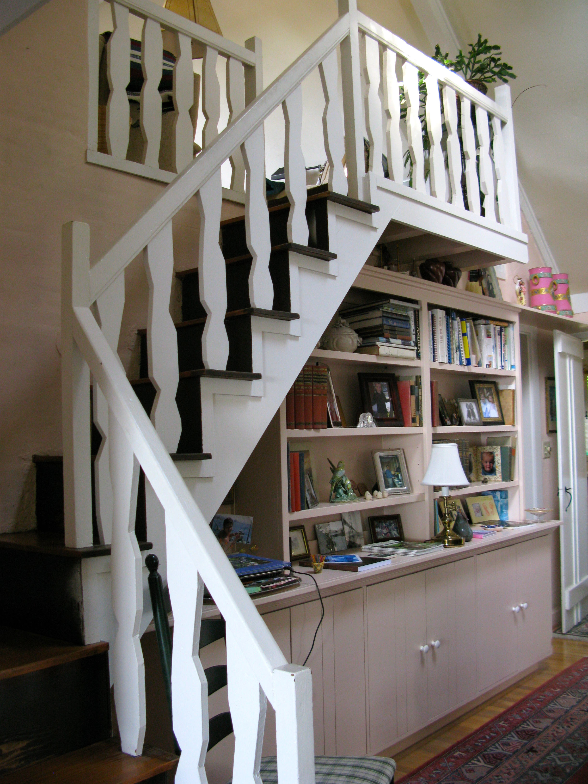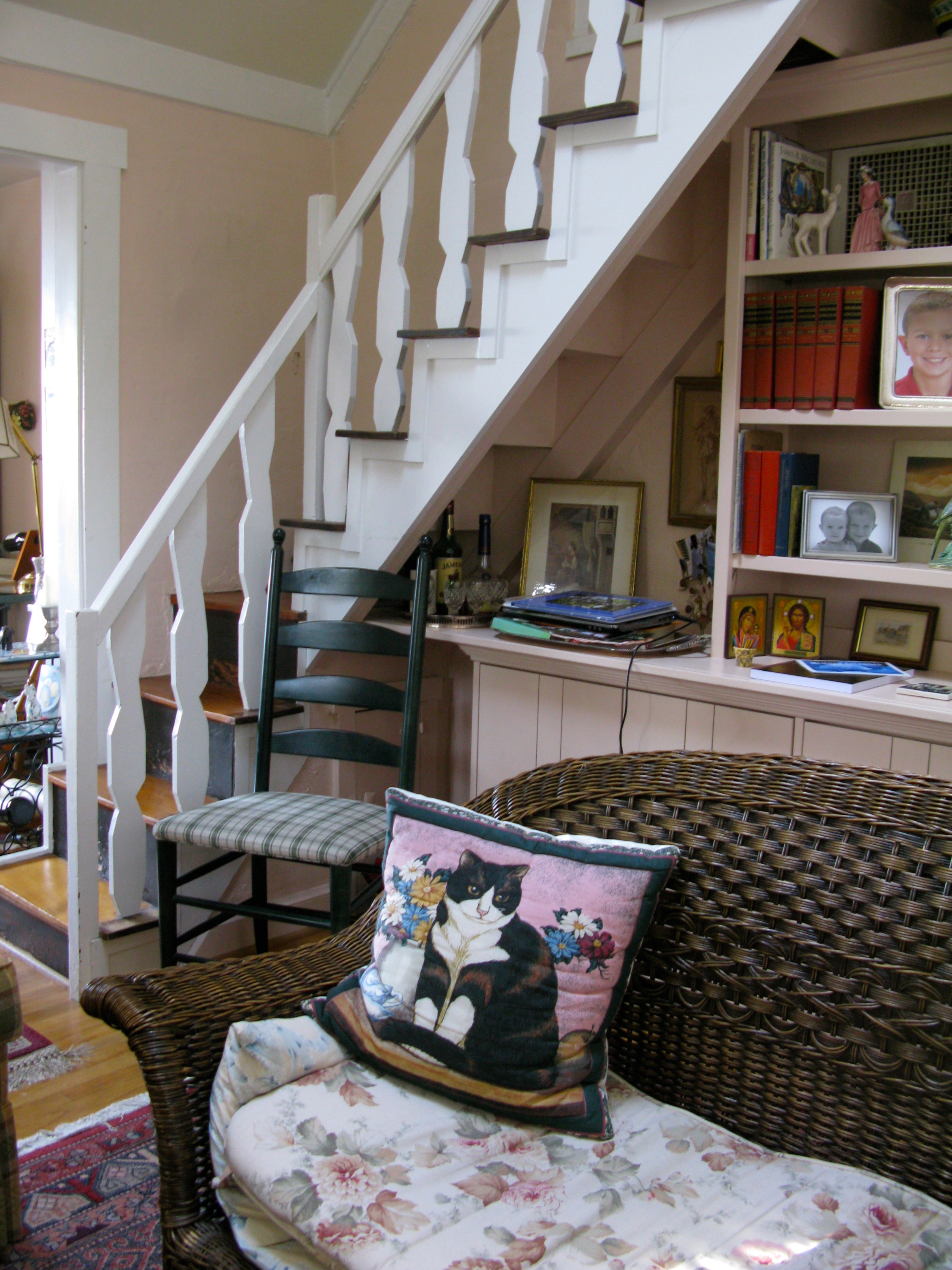 How beautiful this house under the tree is ! This cottage is so inviting and they have such a nice garden. I love the bookshelves under the stairs and the soft pink color on the walls.