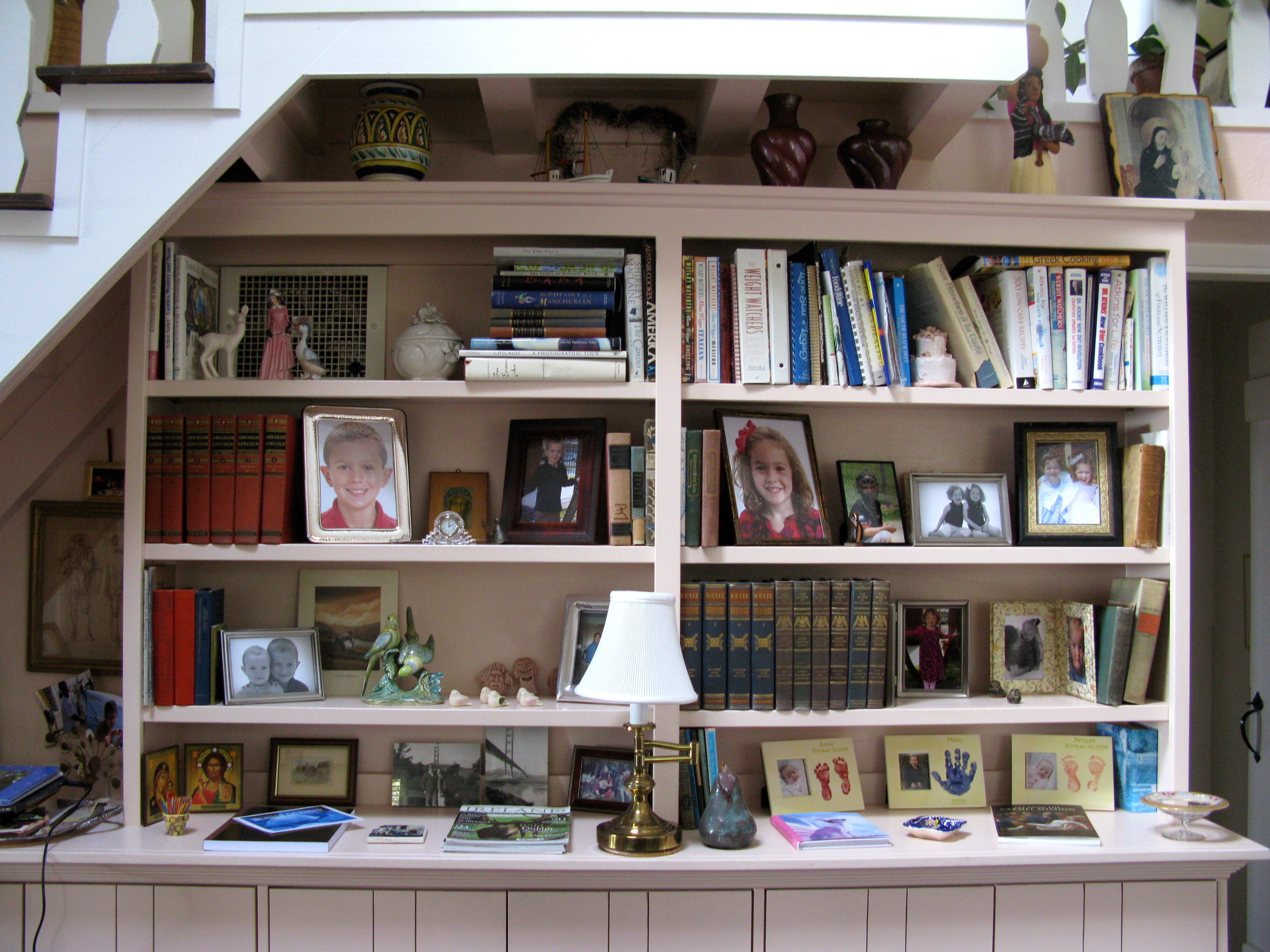 bookshelves overflow with books and photos of grandchildren back in Chicago.