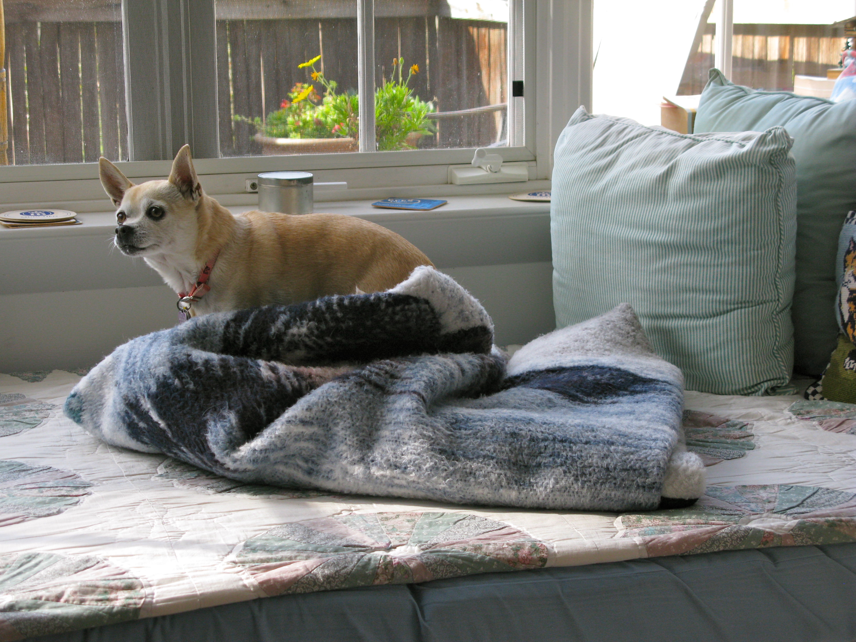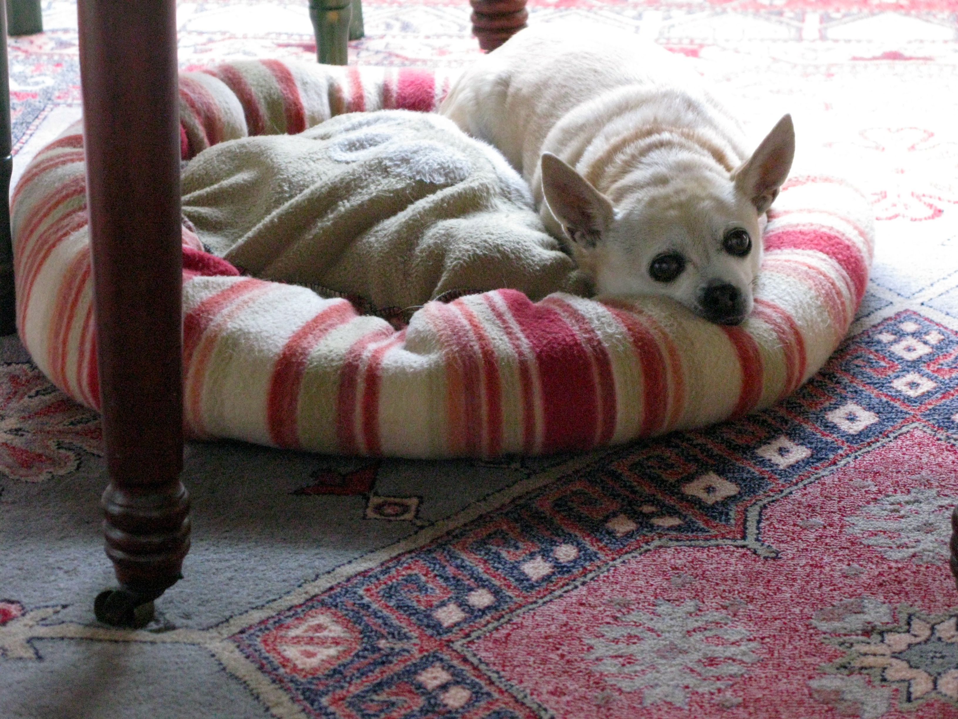 By this time, my little dog pal is in his bed under the dining room table and still shivering.