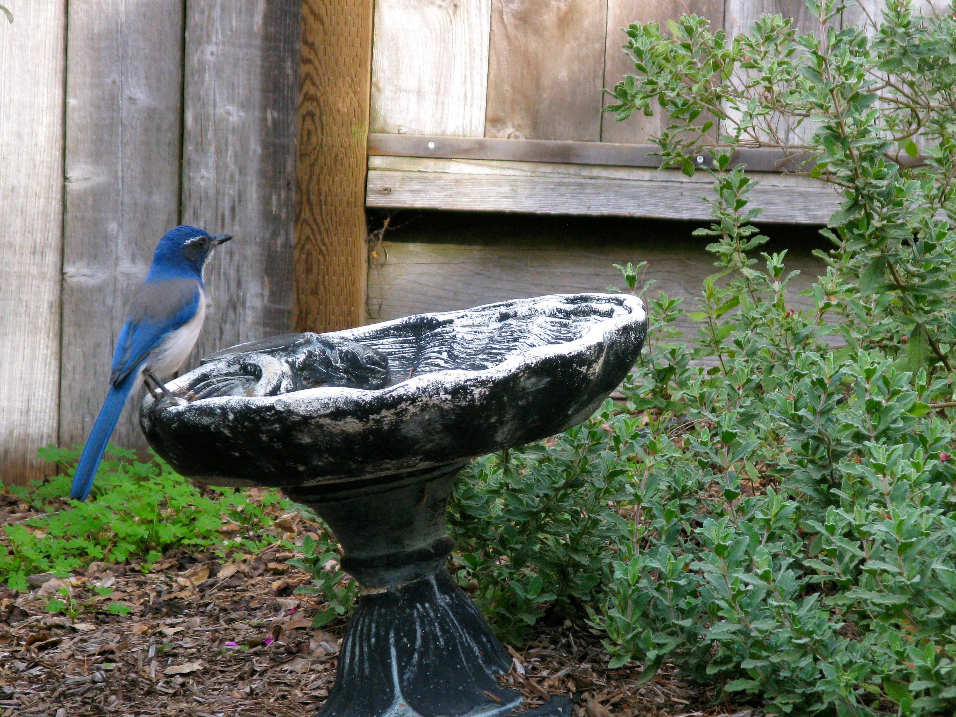 The back garden tumbles down the hill. A stellar Jay getting a drink allows me to snap a shot.