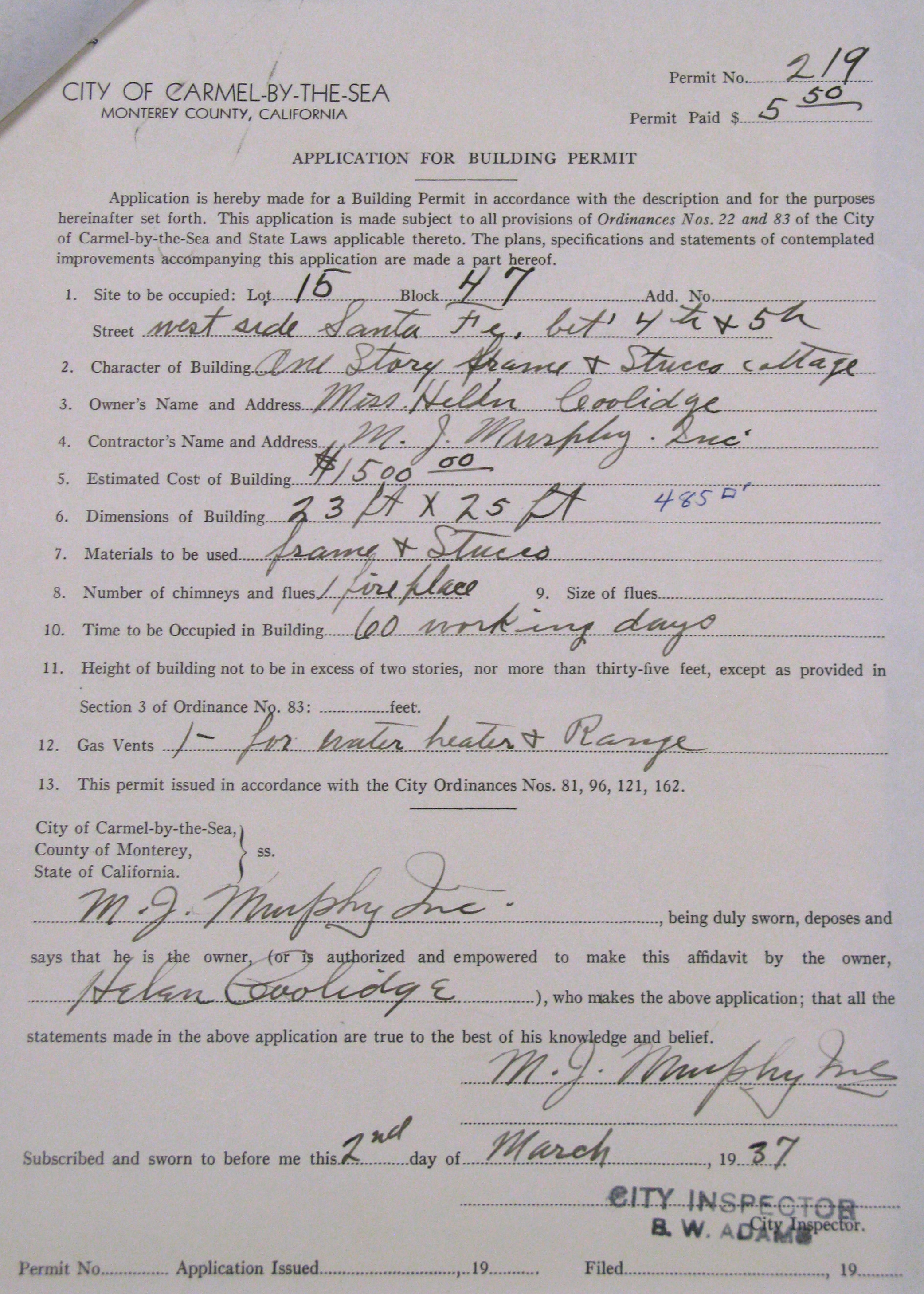 He built the Condry cottage in 1937 for Mrs. Helen Coolidge. It was 23 ft by 25 ft., 485 square feet of charm. It cost $1500.00 and was completed in 60 working days.
