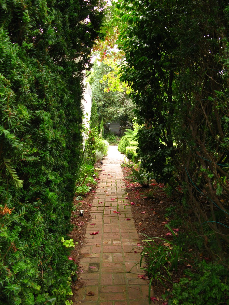 I notice a narrow opening between tall evergreens. A brick path sprinkled with Camilla blossoms calls out “follow me”, so I do.