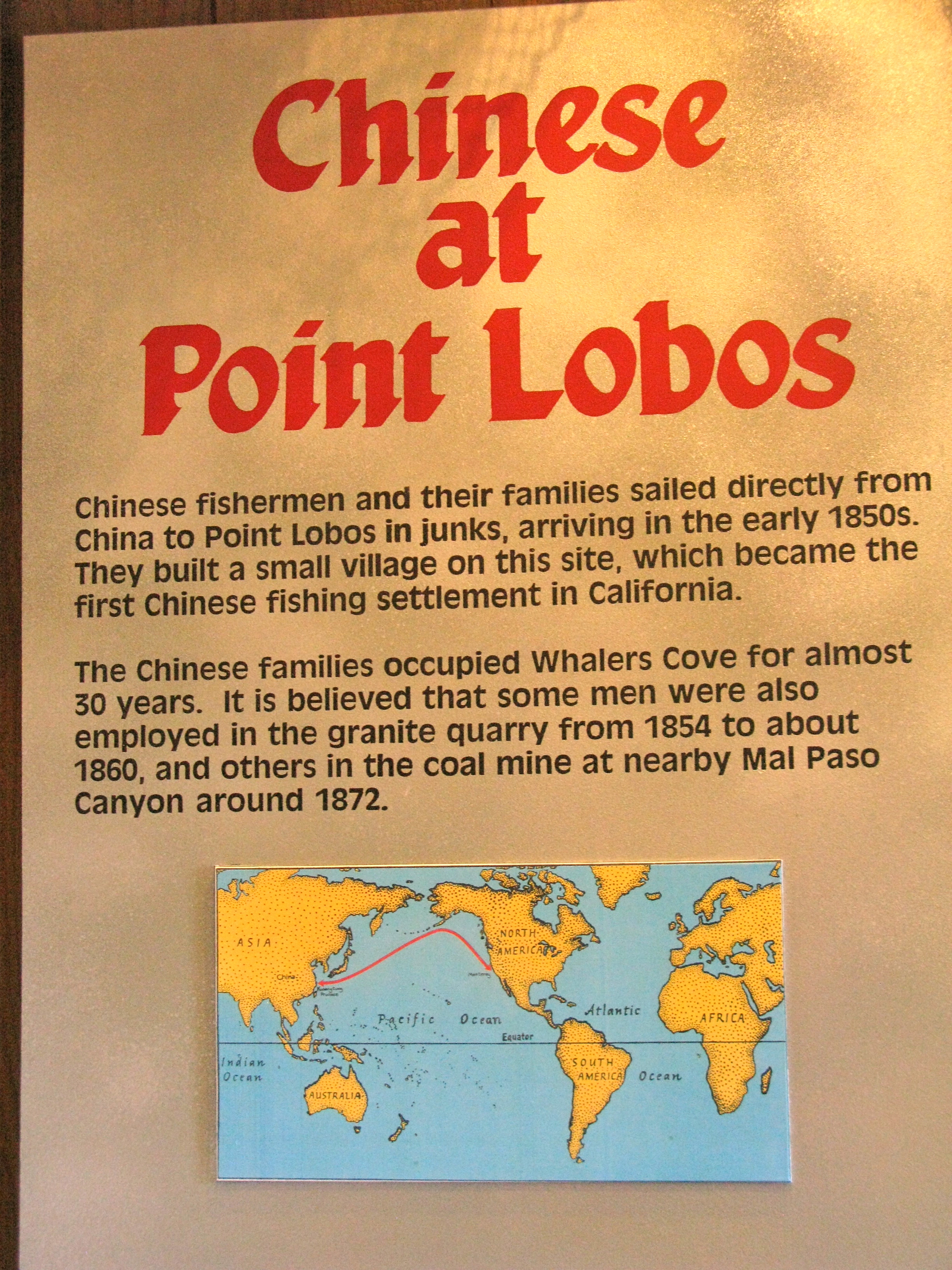 As unbelievable as it sounds, Chinese fishermen and their families sailed directly from China to Point Lobos in junks, arriving in the early 1850’s. They built a small village on this site which became the first Chinese fishing settlement in California. They occupied the Cove for 30 years and built this cabin in 1851.