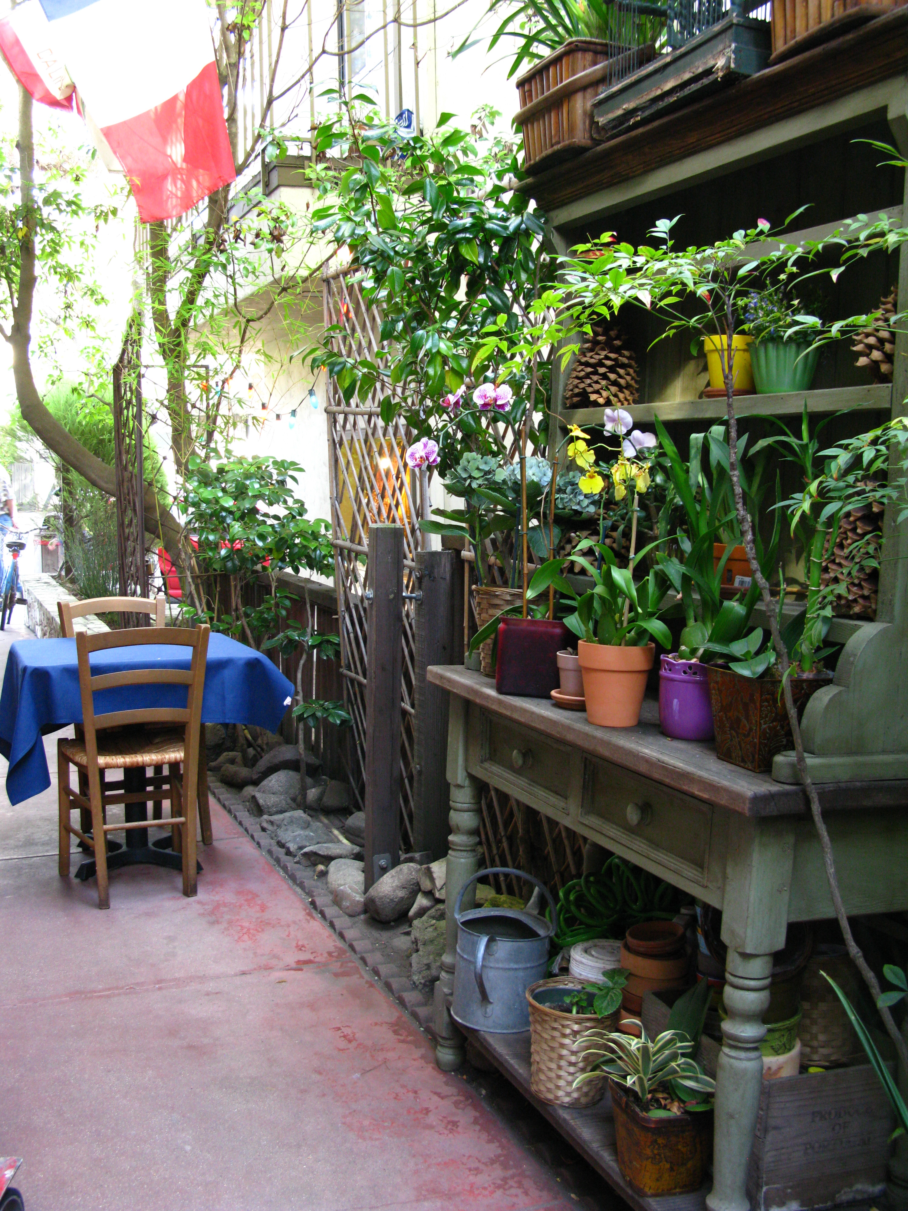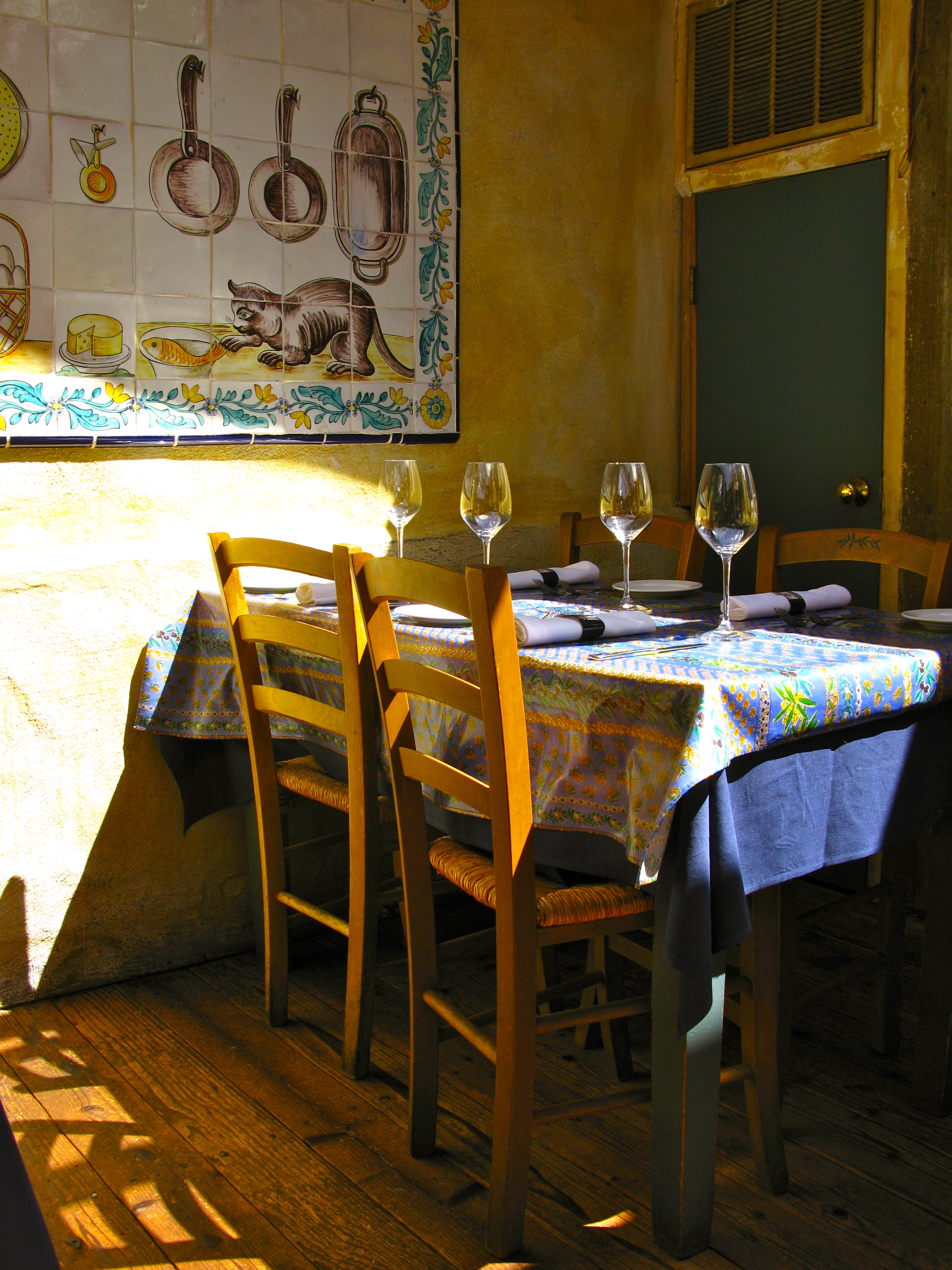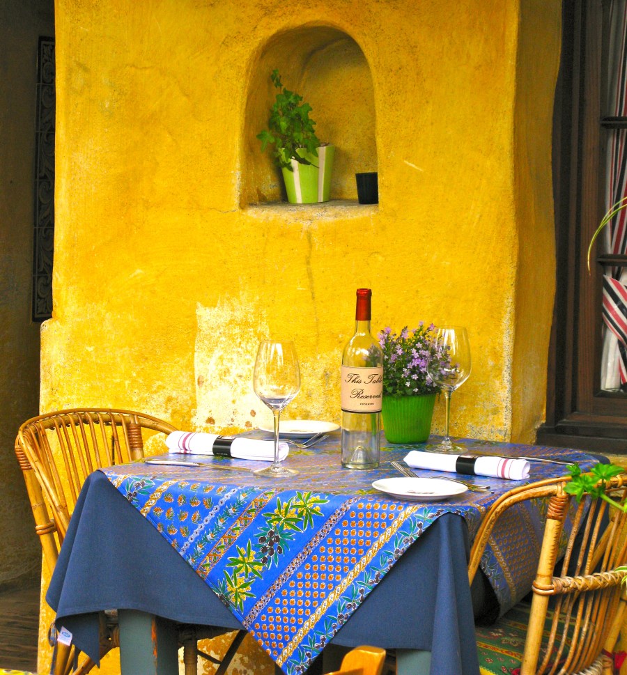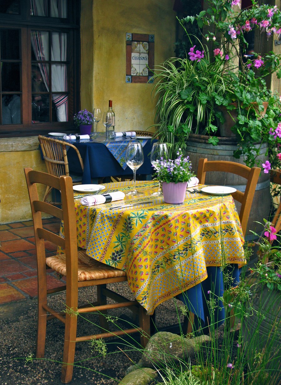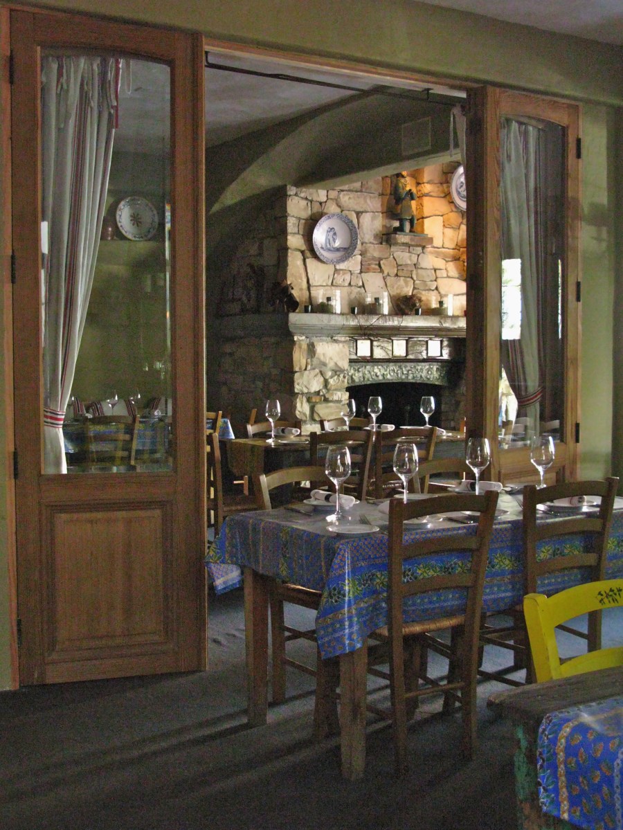Surrounded by lavender and rose-filled planters, it’s a traditional French Provencal dining room with an open-hearth fireplace.