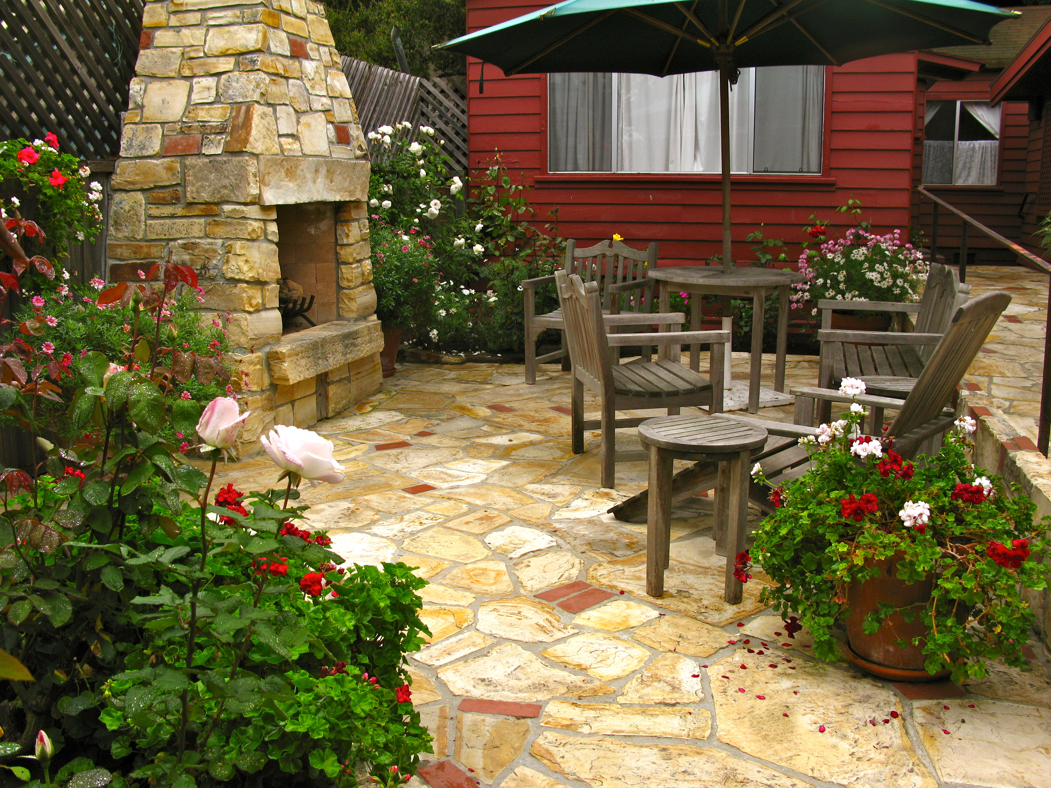 The outdoor patio has a Carmel stone fireplace.