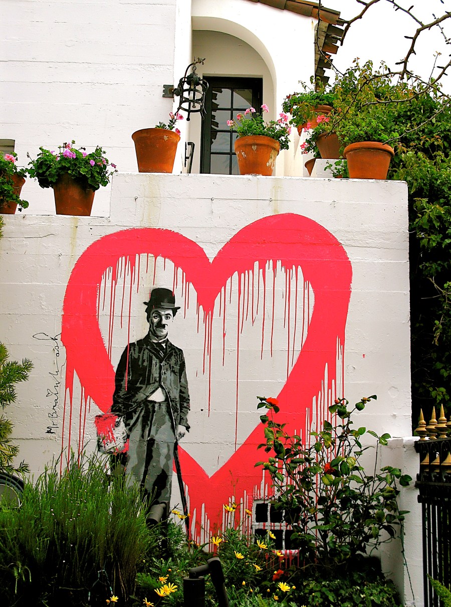 Those are not banksy pieces! They are done by a copy-cat artist called “Mr. Brainwash”. The Charlie Chapin piece, at least, is even signed by mr brainwash.