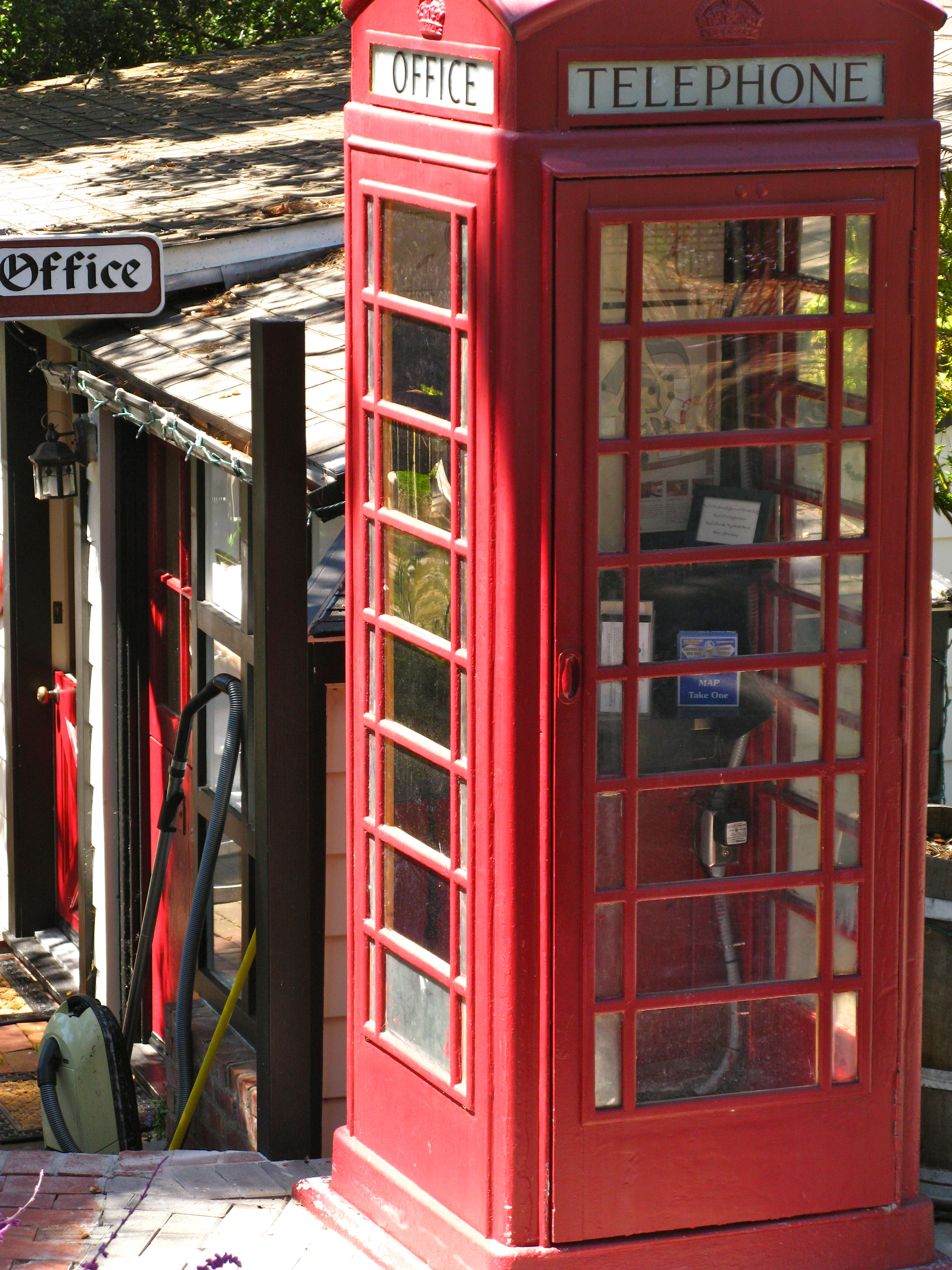 and I look down to the red telephone booth outside the office.