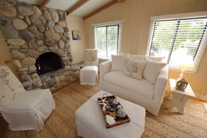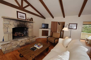 with its stone fireplace.