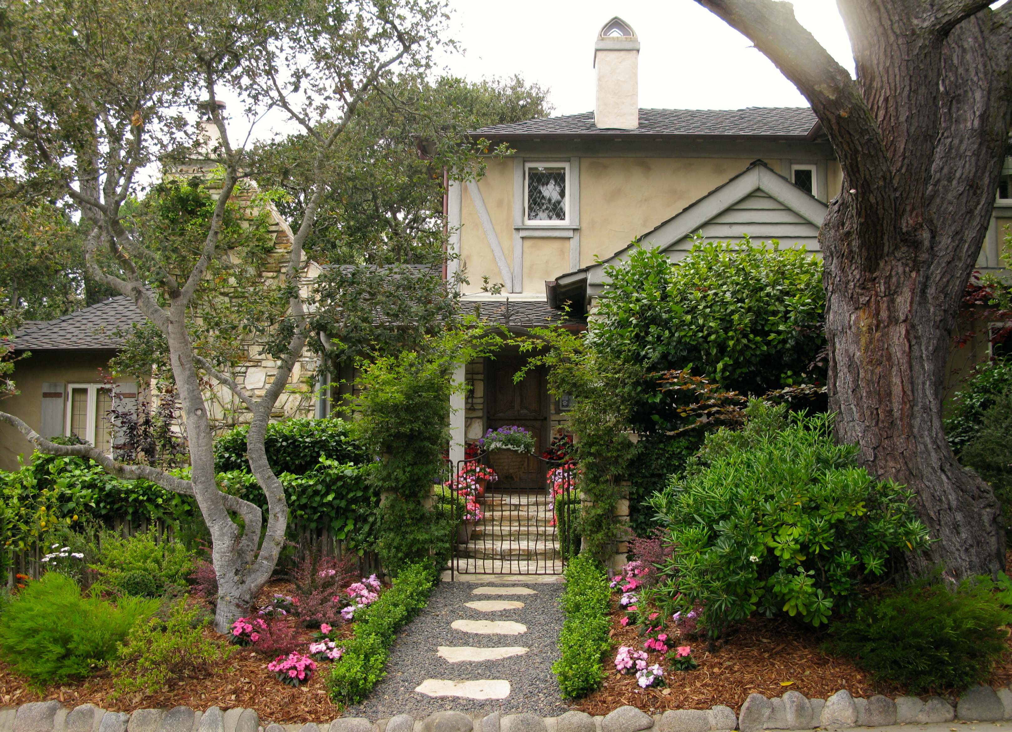 I notice subtle touches at once. Stepping stones have been set in the pea gravel and plantings of boxwood and Impatiens draw the eye to the front door.