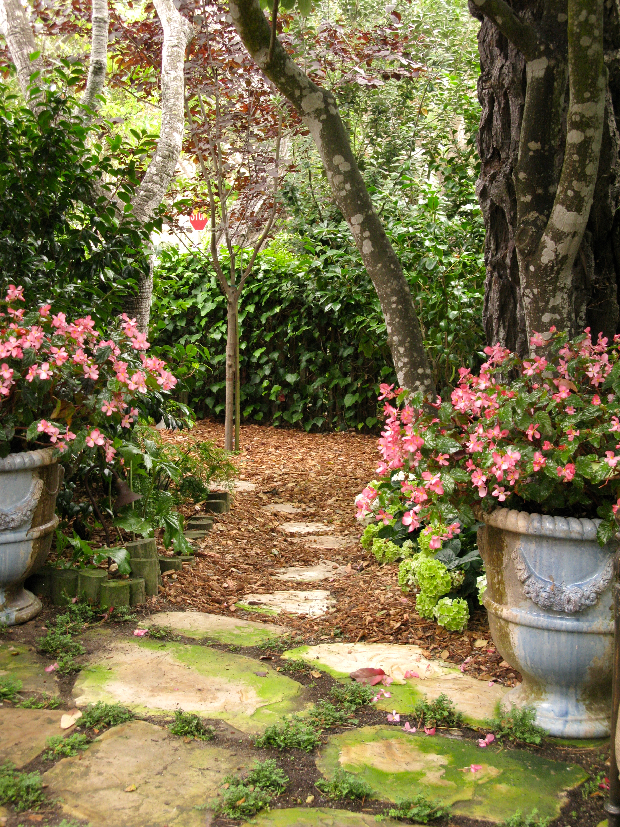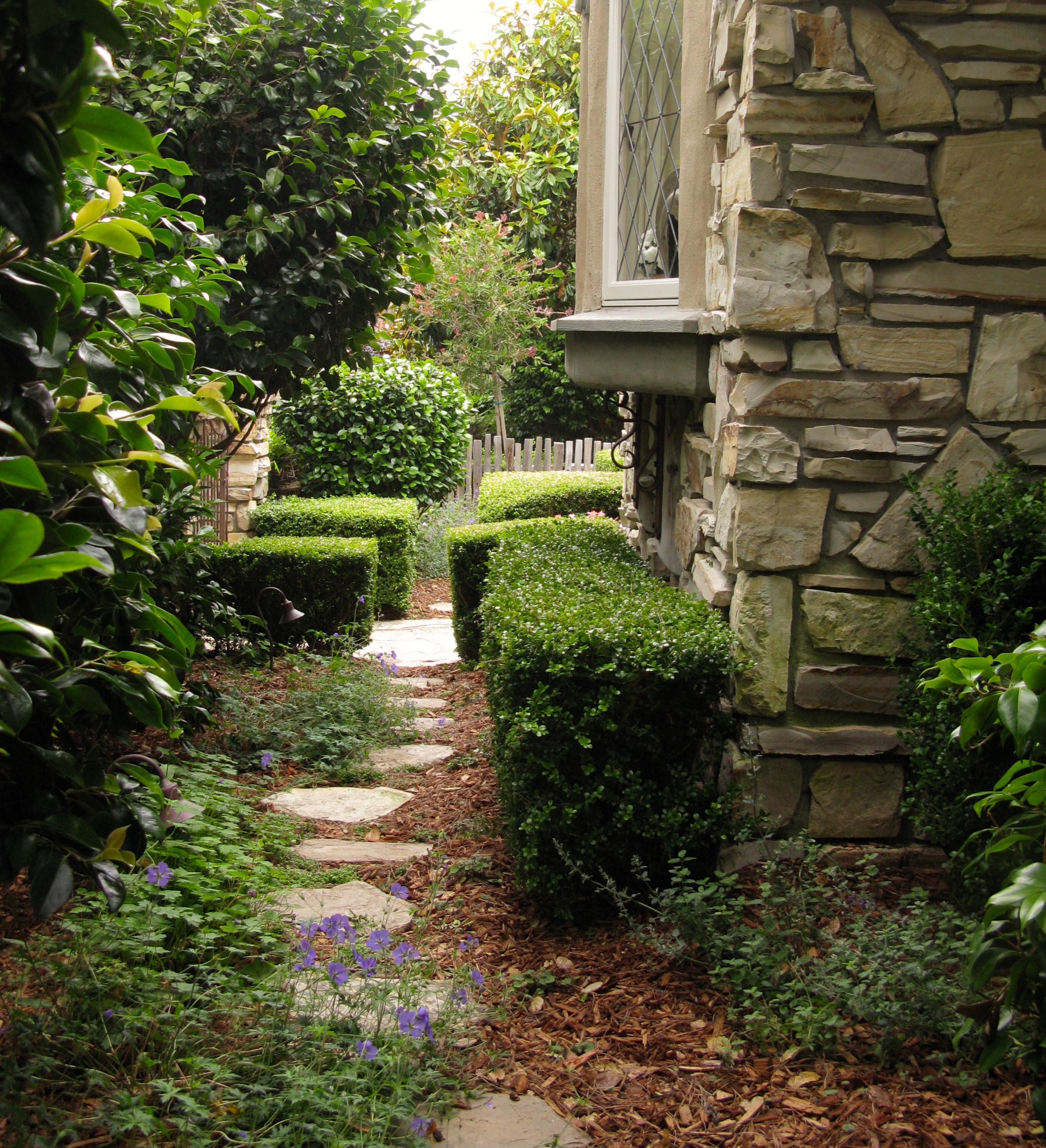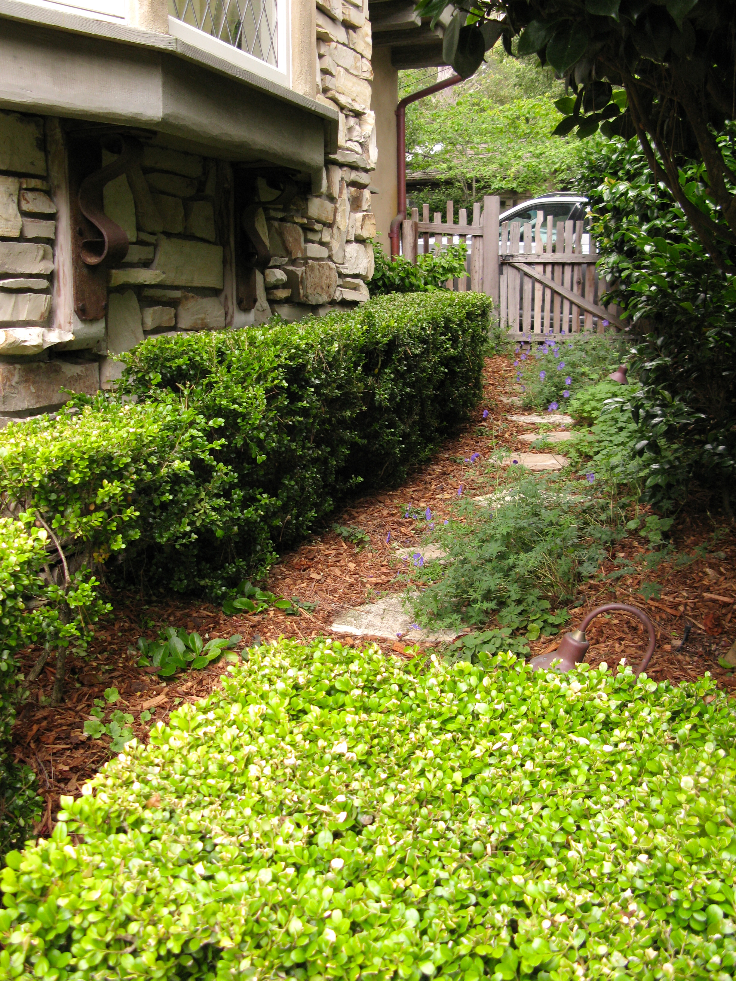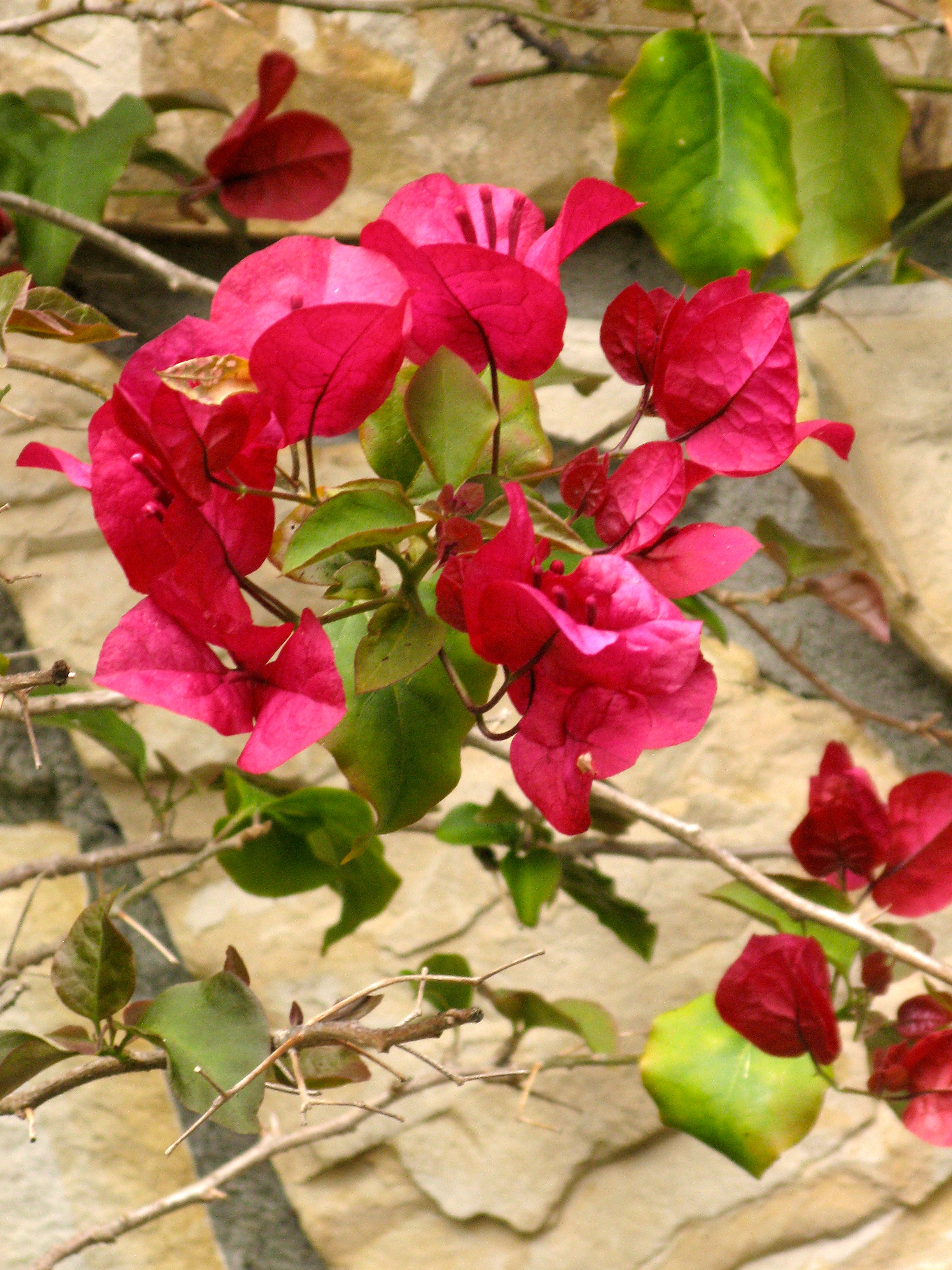 Bougainvillea is starting to climb the stone wall.