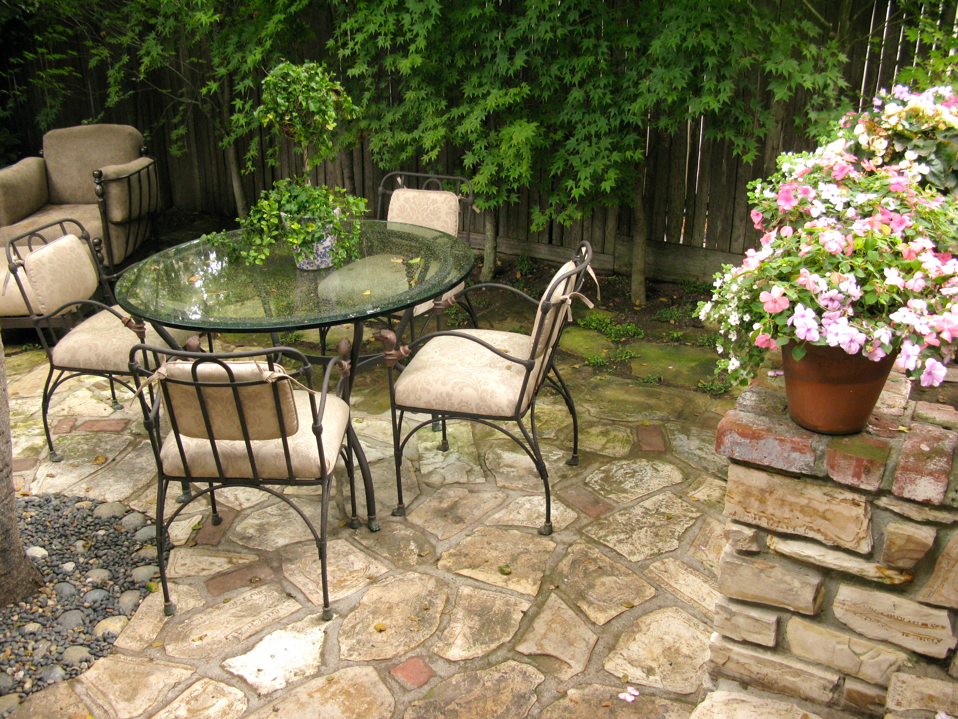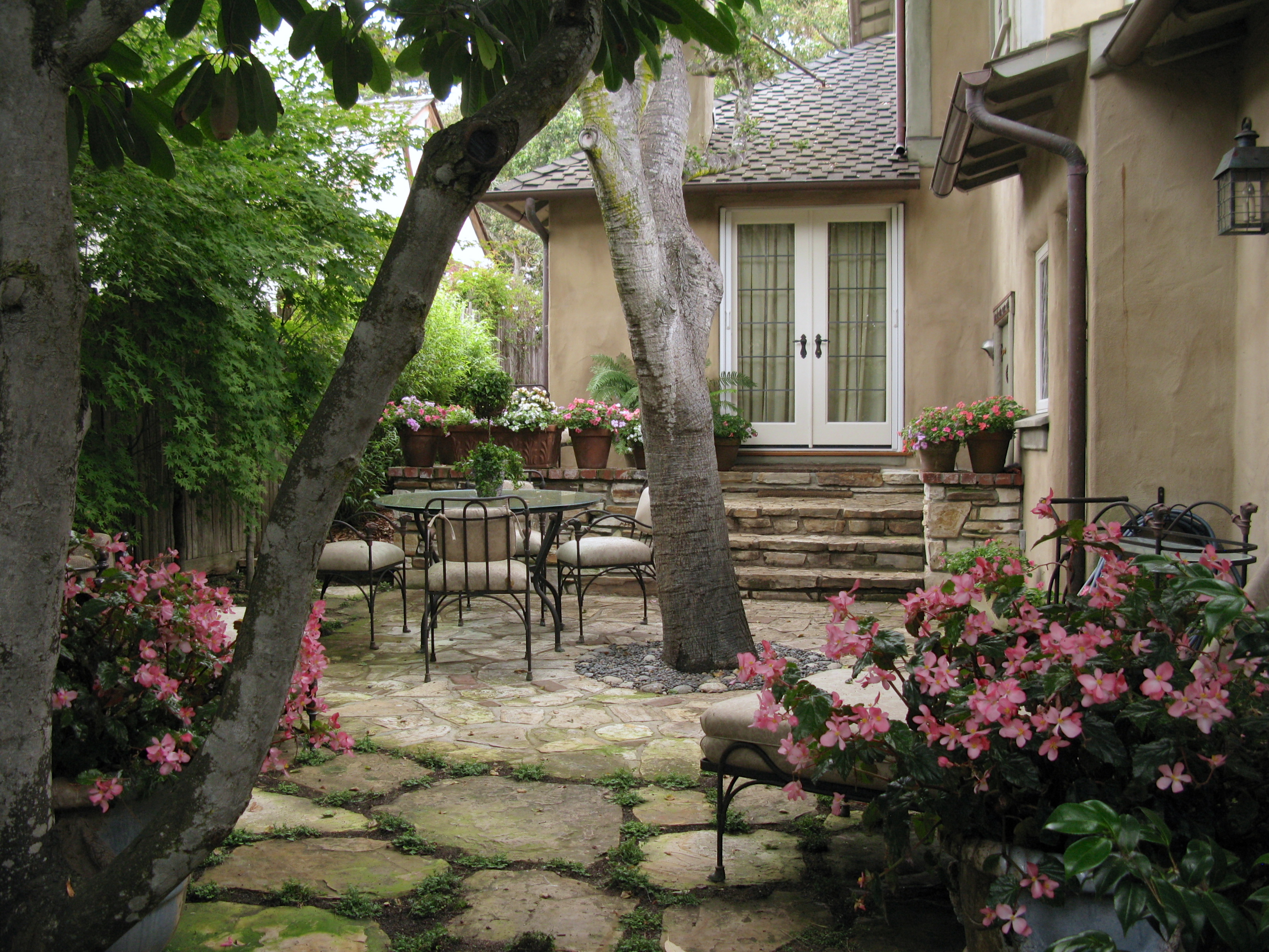 Soft pink and white plantings and cushioned furniture compliment the lovely color of the stucco.