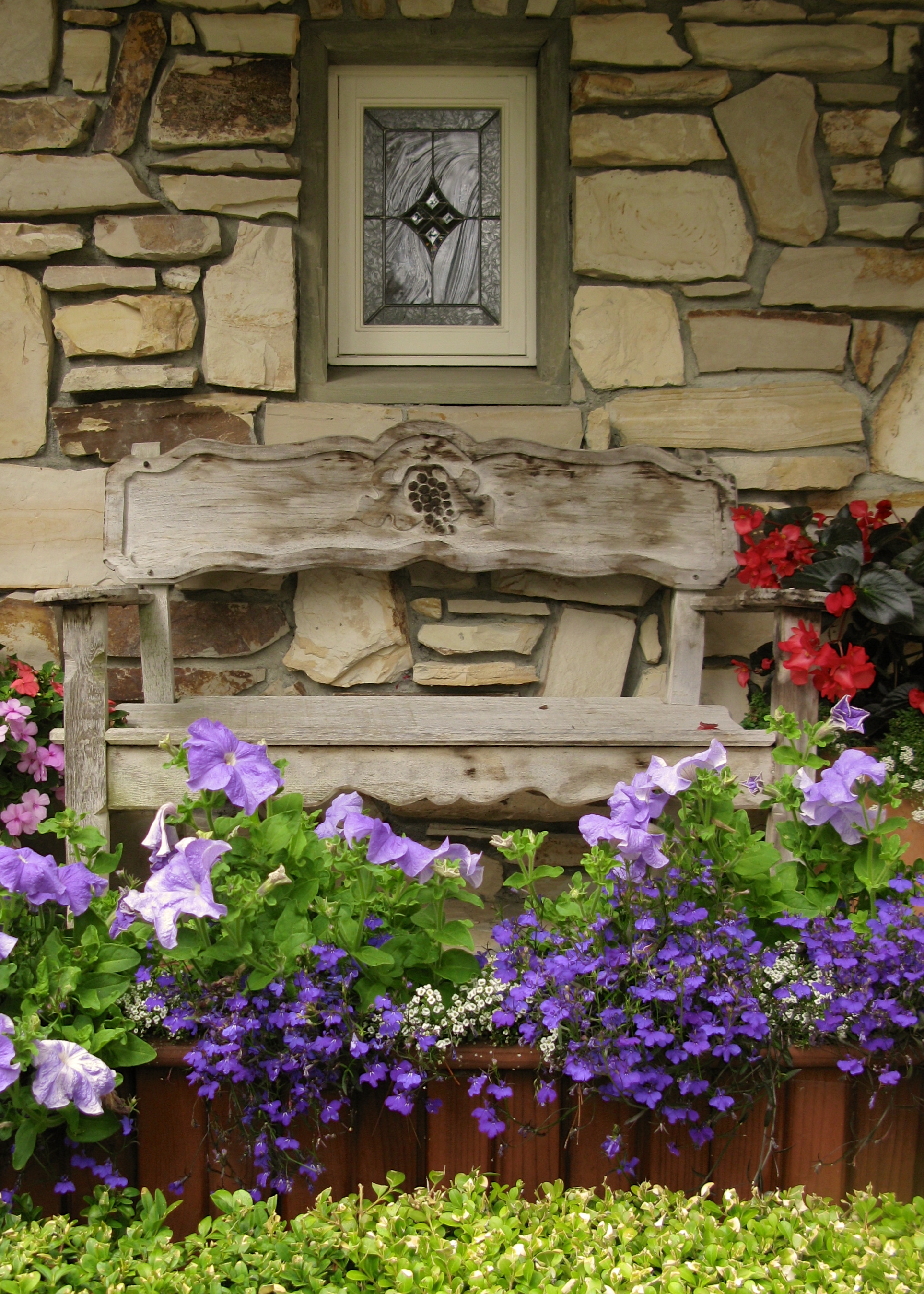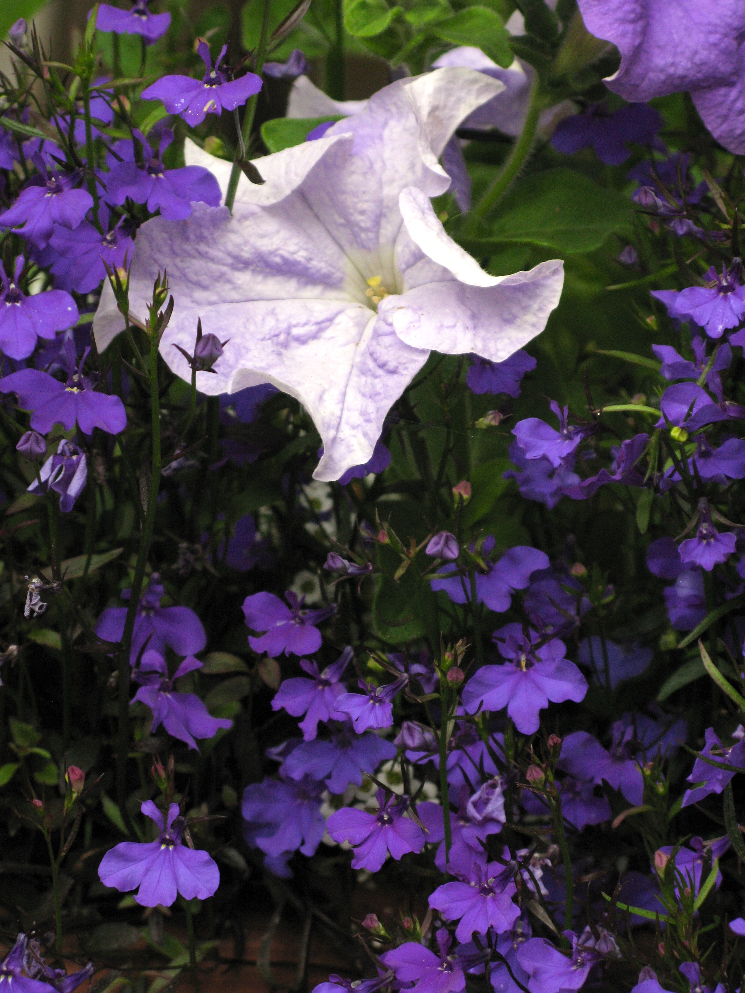 Back again at the bench, this planter of blue lobelia and petunias catches my eye.